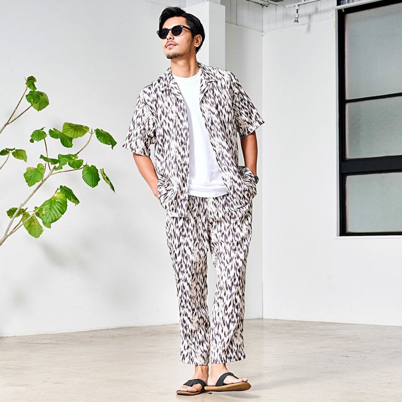 同素材のシャツと合わせれば、統一感のある大人のリゾートスタイルが完成。