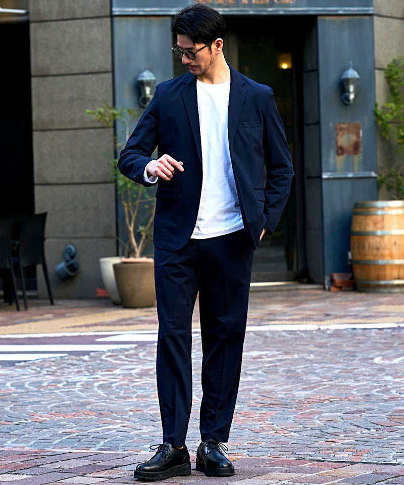 テーラードジャケットとテーパードパンツの洗練されたセットアップ。