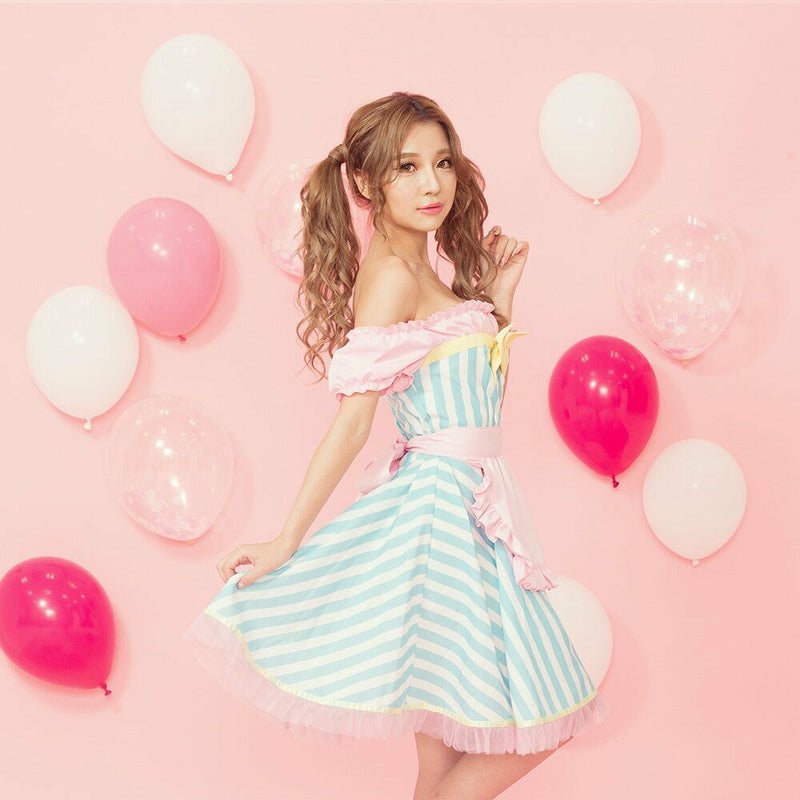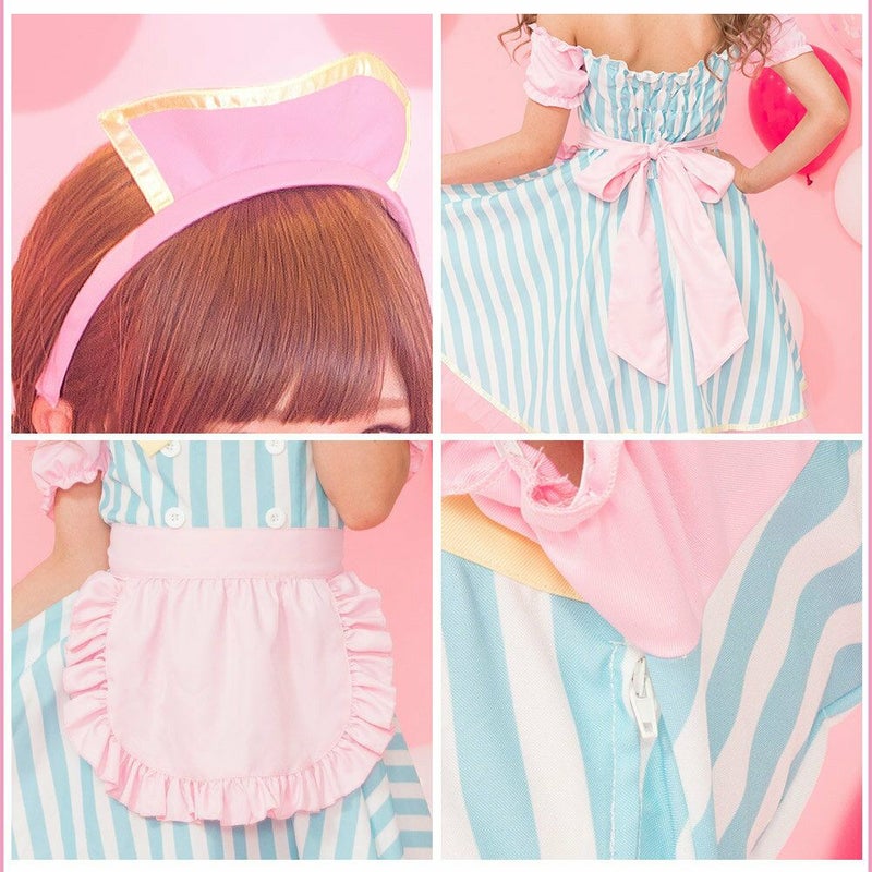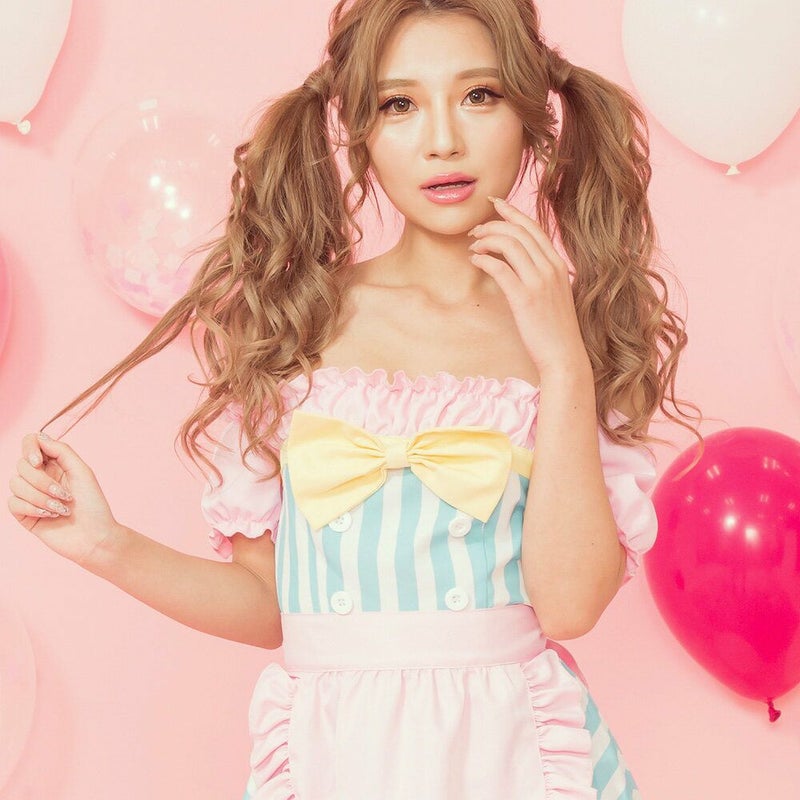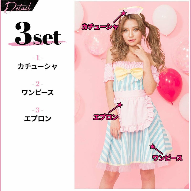 女の子らしいミルキーカラー!他と差をつけるメイド&ウェイトレス衣装です。 くしゅっとしらオフショルダー部分がポイント◎ エプロンやリボンなどメイドさんぽい小物も充実。背中のファスナーで着用してください♪
