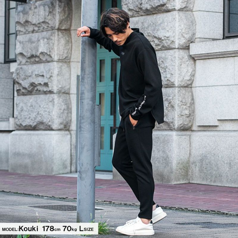 ストレッチの効いたポンチ素材を使用したセットアップ。