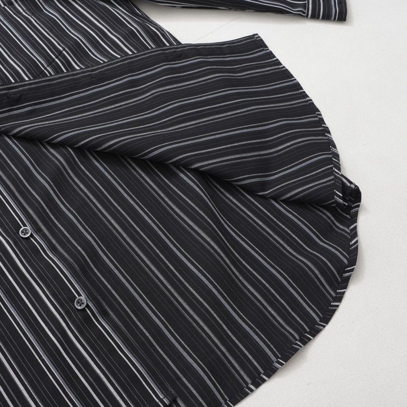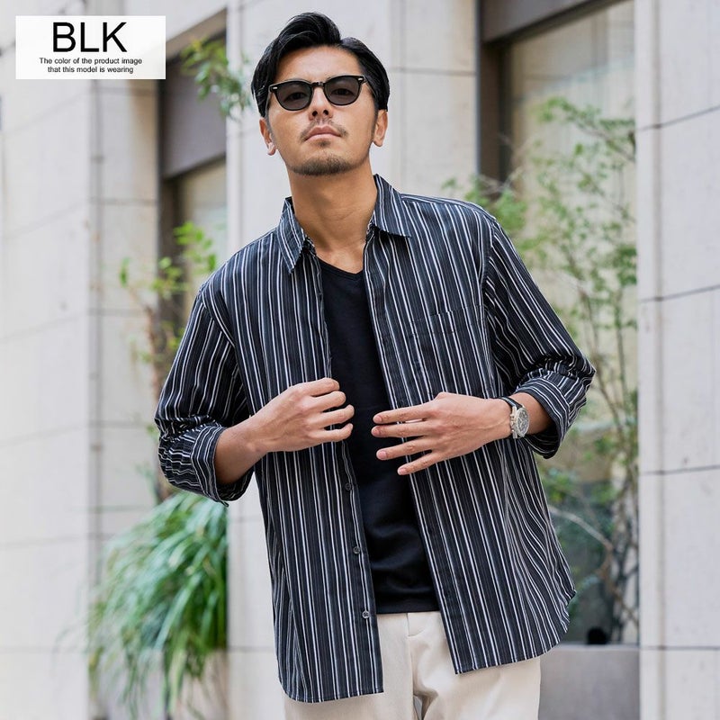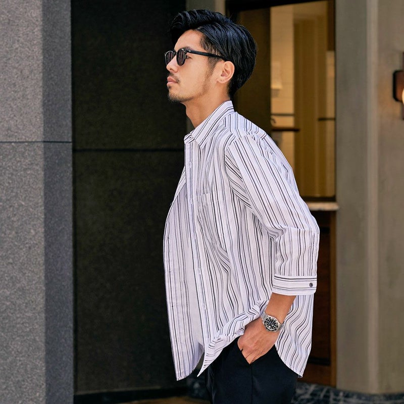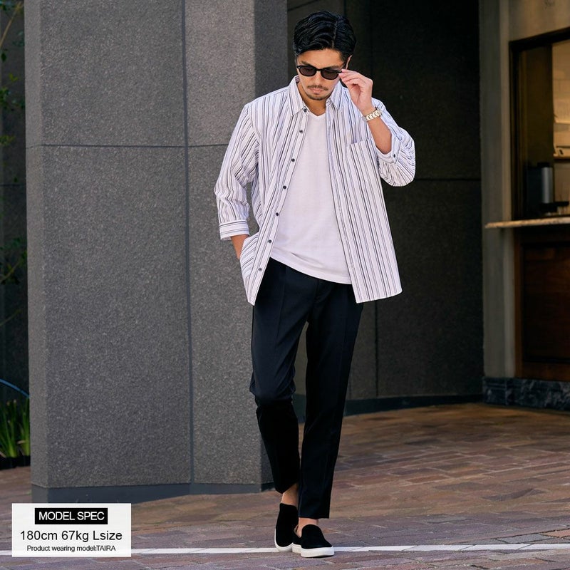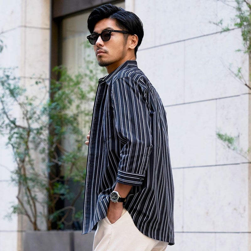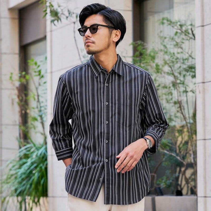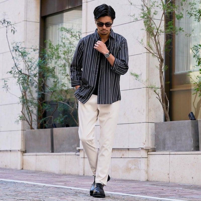 シャツは、上品な印象のストライプ柄が特徴。