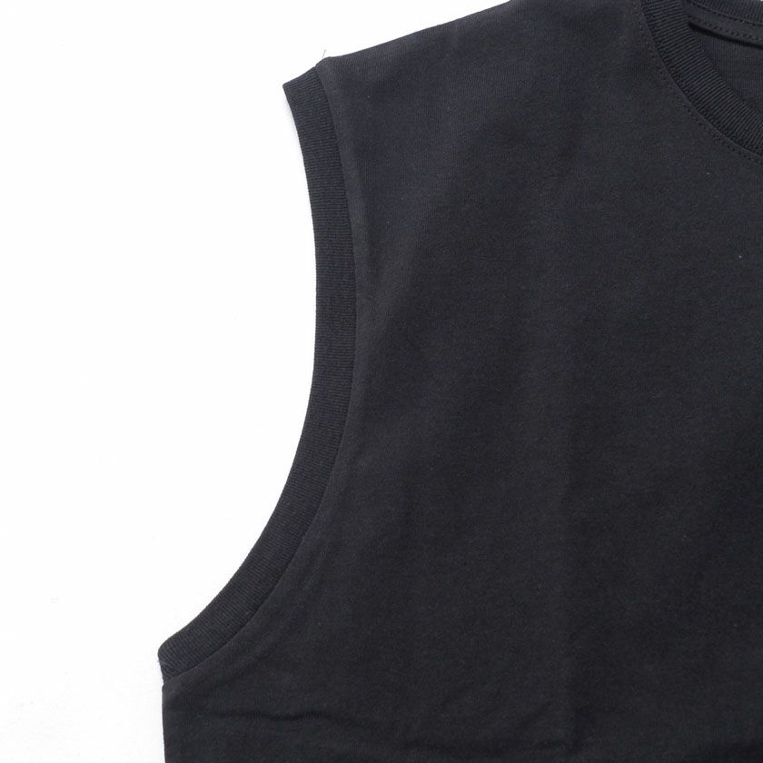 左胸にブランドロゴのワッペンを施したシンプルなデザインのノースリーブTシャツ。