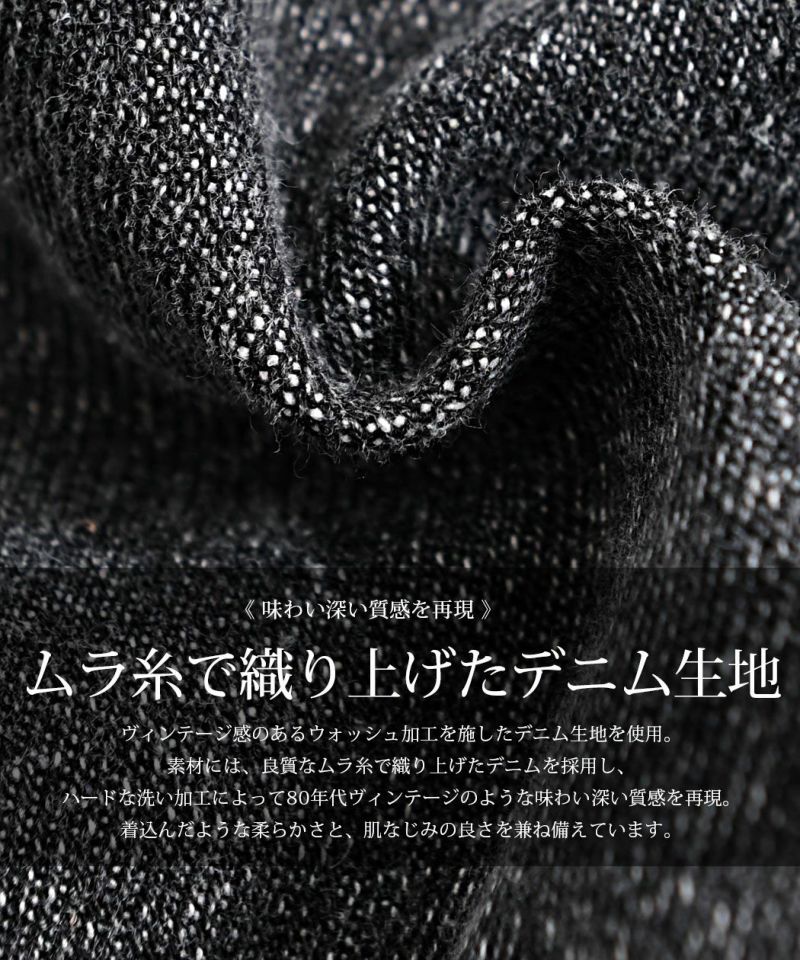 素材には、良質なムラ糸で織り上げたデニムを採用し、ハードな洗い加工によって80年代ヴィンテージのような味わい深い質感を再現。