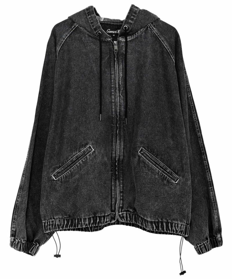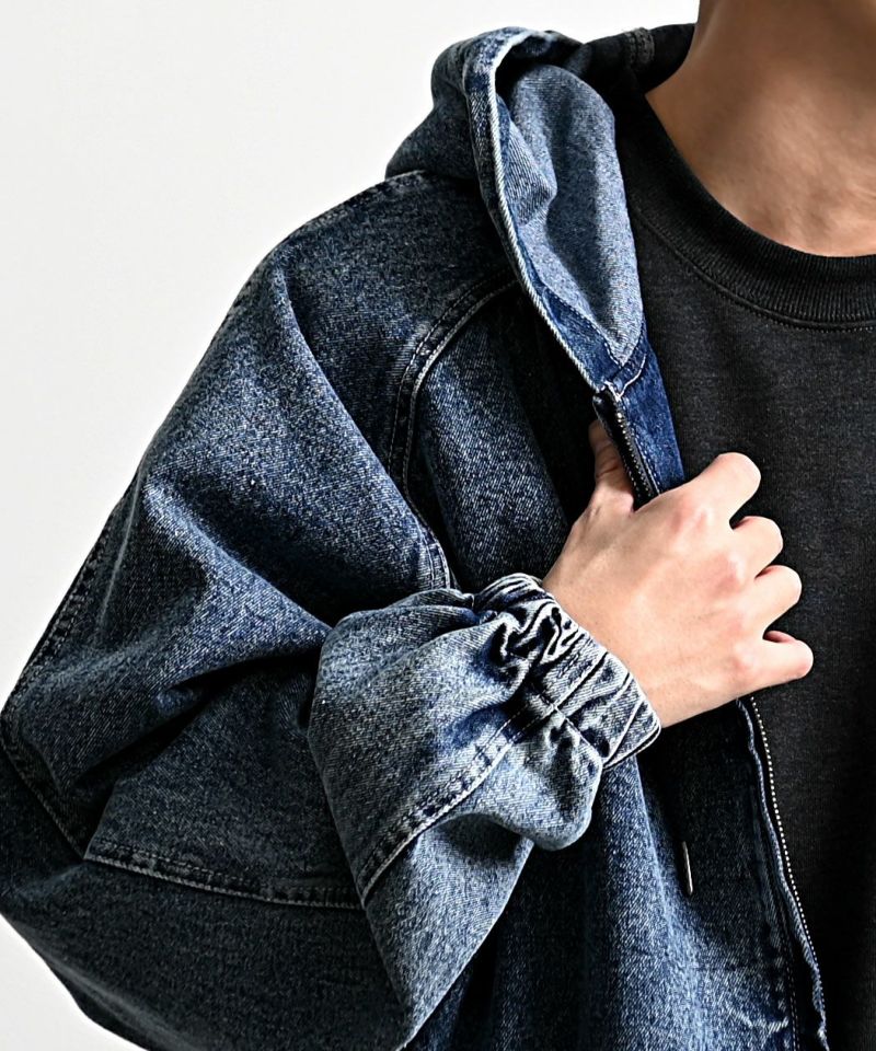 ヴィンテージ感のあるウォッシュ加工を施したデニム生地を使用した、フード付きジップパーカー。