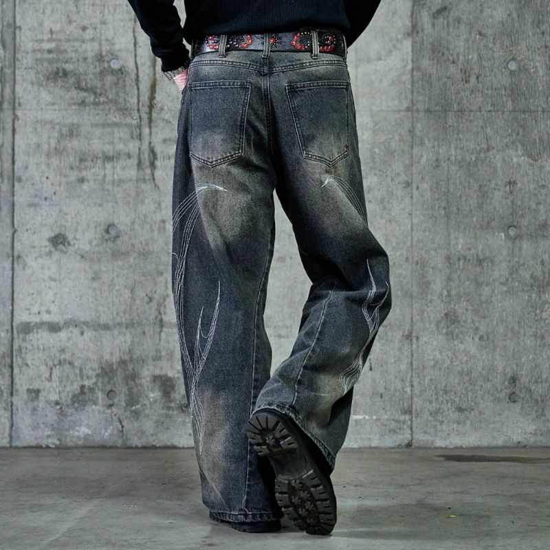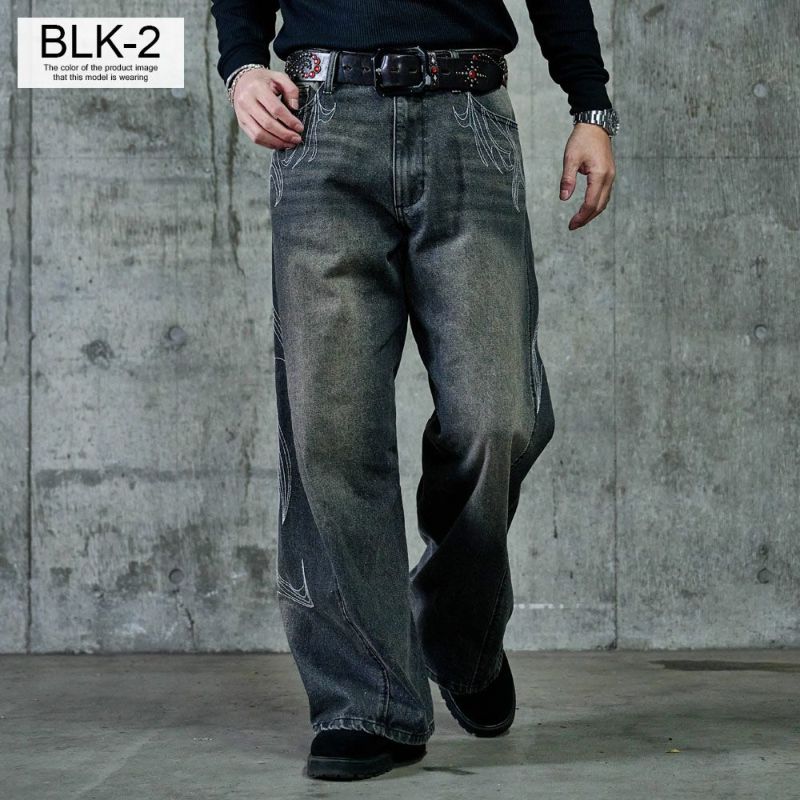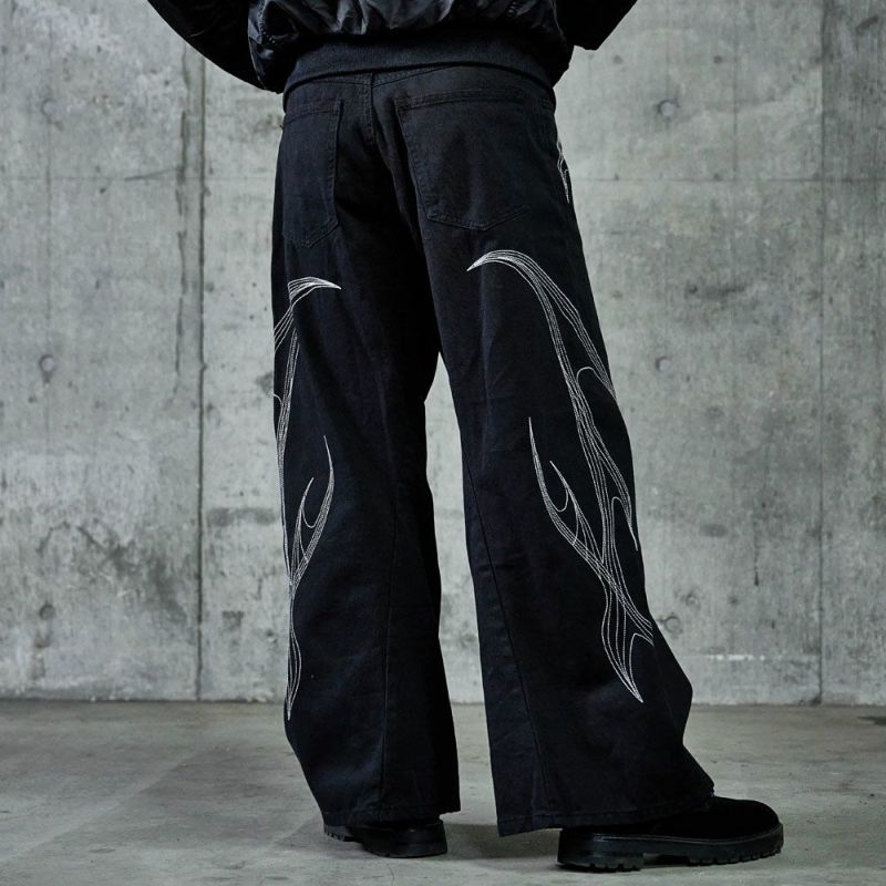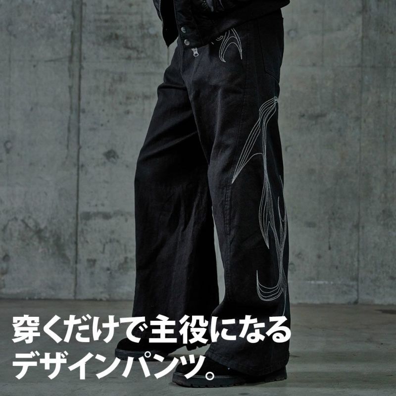 存在感のある刺繍デザインが目を惹くカーブシルエットパンツの登場です。