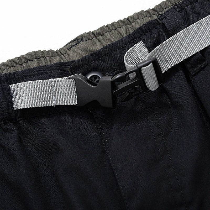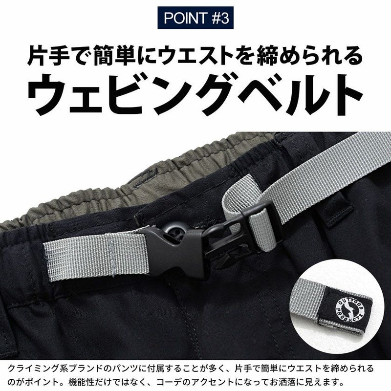 ウエストはシャーリングゴム仕様で、片手で着脱可能なクライミングバックル付き。
