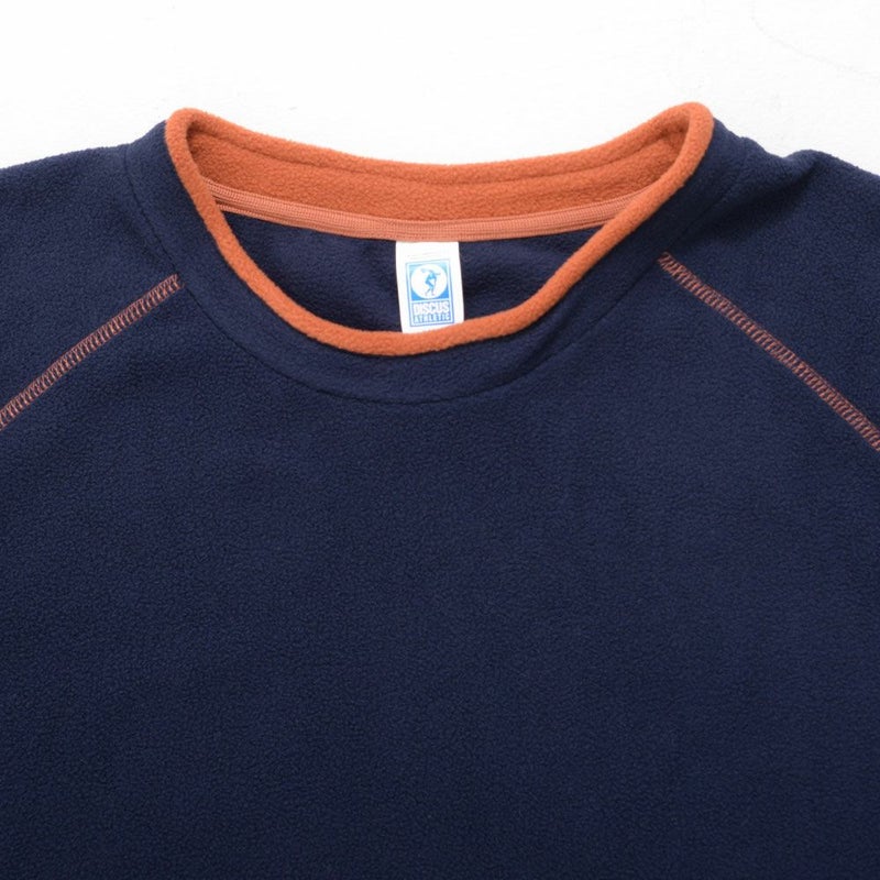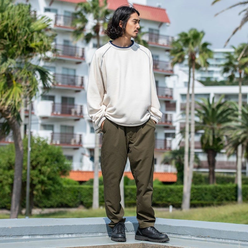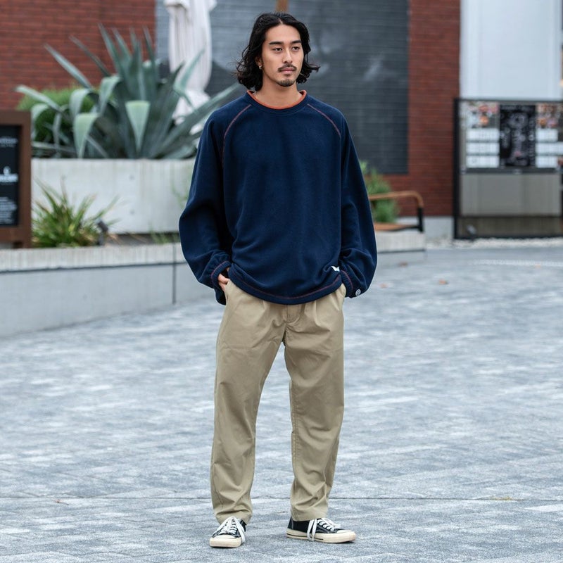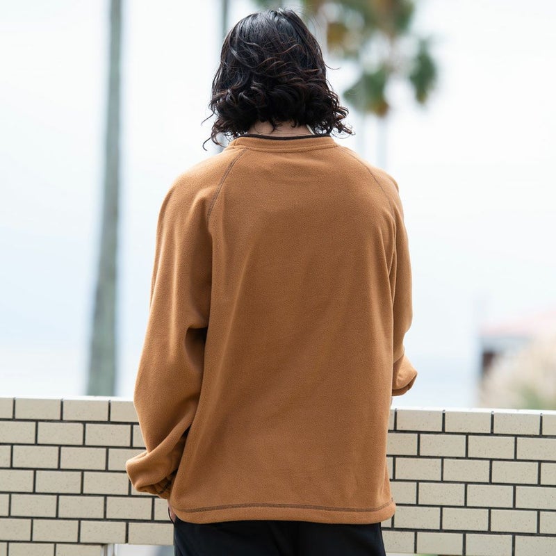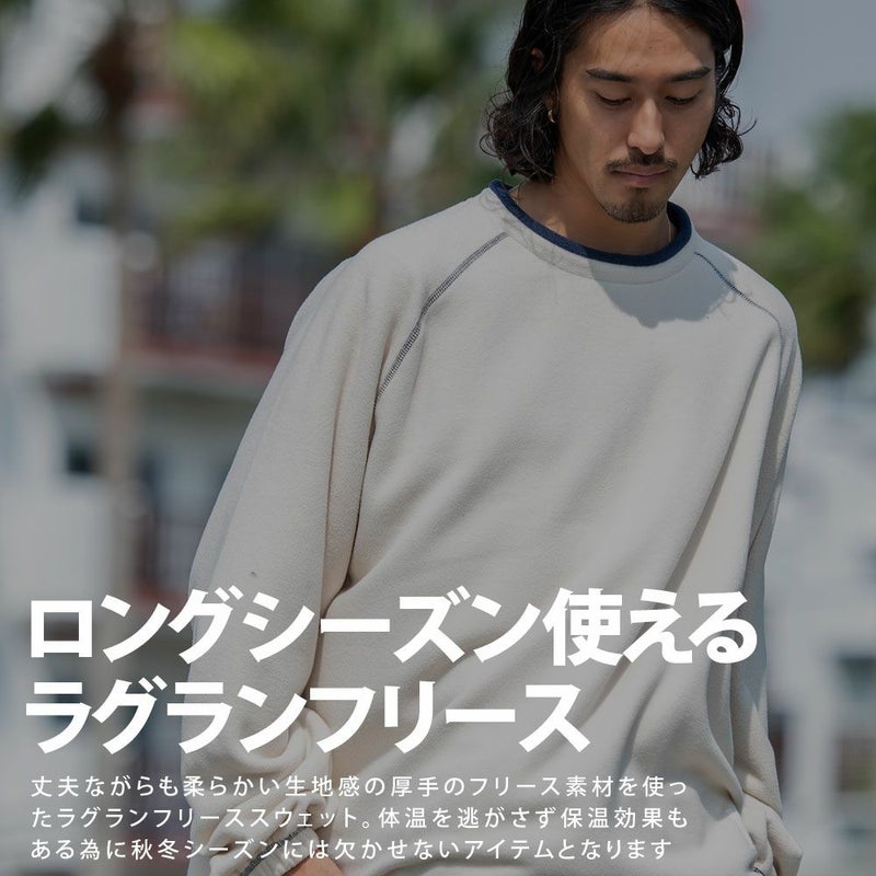 古着テイスト感もあるデザインが特徴のクルーネックのラグランフリース。