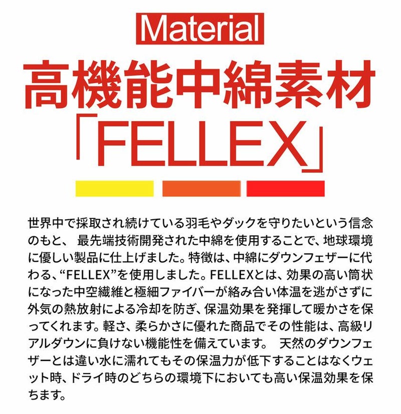 FELLEXとは、効果の高い筒状になった中空繊維と極細ファイバーが絡み合い体温を逃がさずに外気の熱放射による冷却を防ぎ、保温効果を発揮して暖かさを保ってくれます。