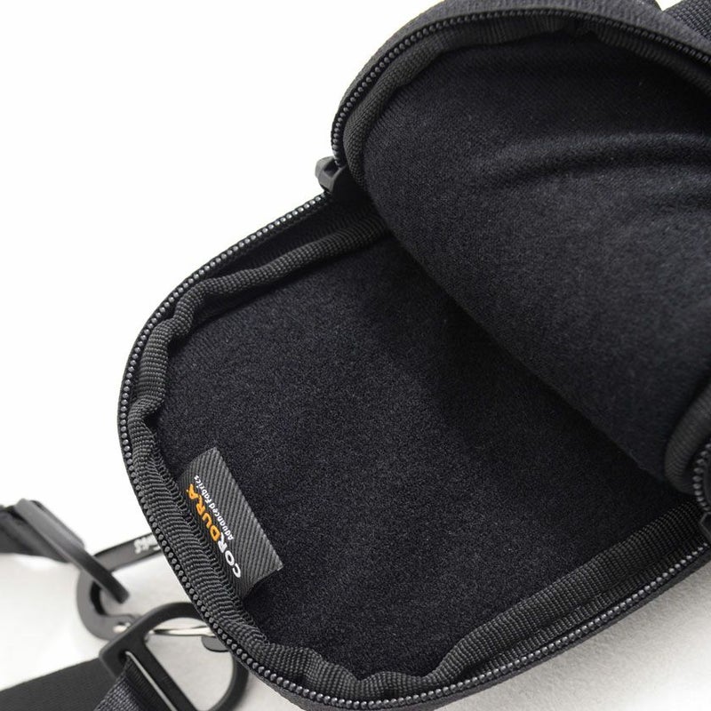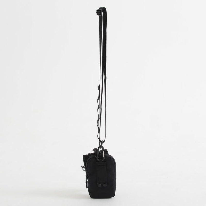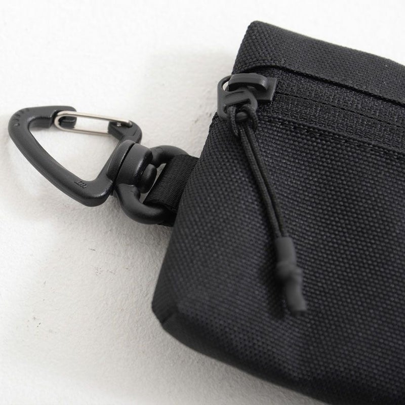 スマホサイズのポーチの裏地には起毛した素材を使用しているため、電子機器の収納に最適です。付属のカラビナでストラップに鍵など付けれる仕様。