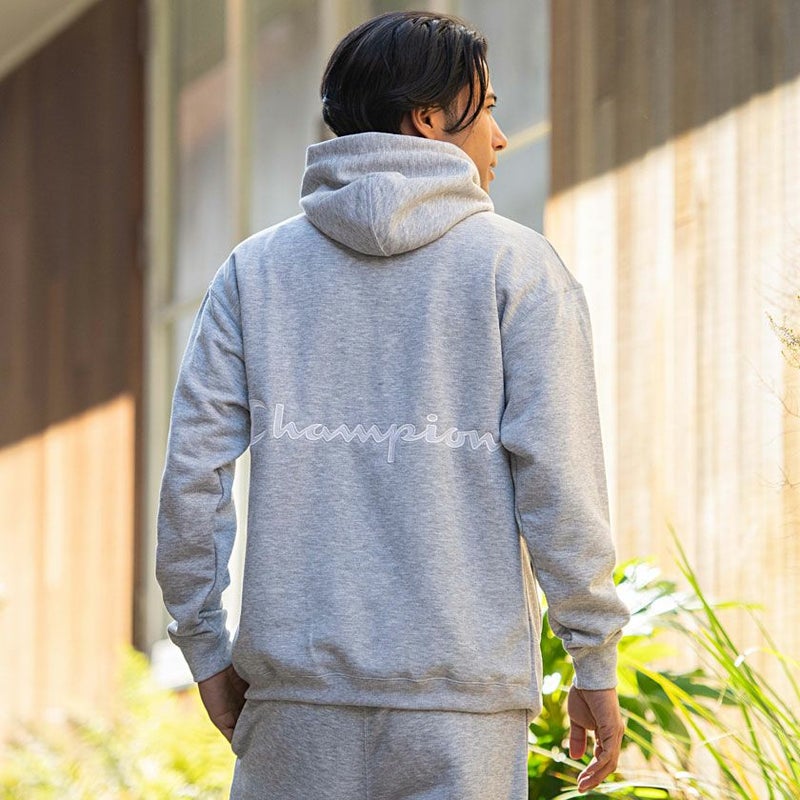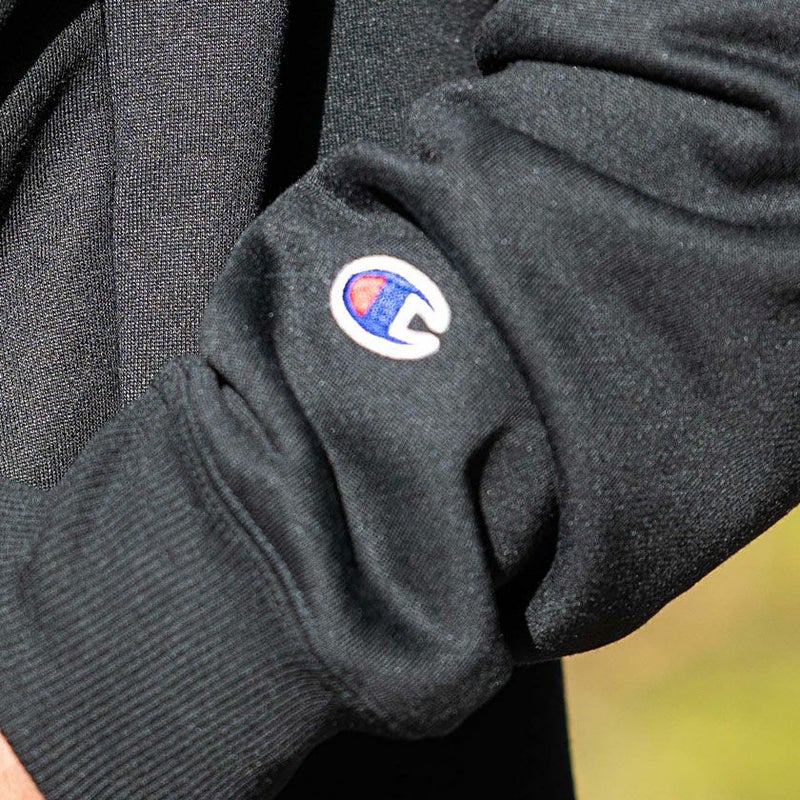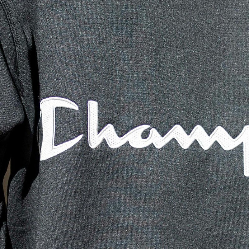 胸にはChampion(チャンピオン)ロゴのシリコンワッペン、背中にはメッシュ素材のChampionロゴのアップリケを付けています。