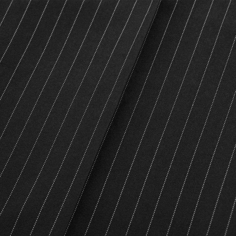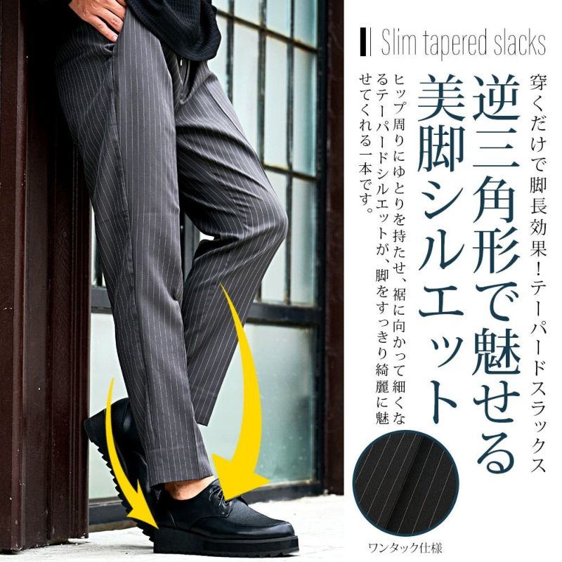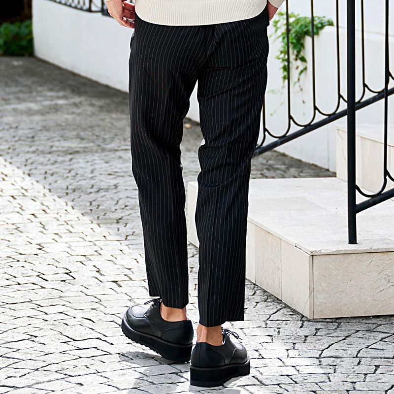 上品な光沢と滑らかな肌触りが高級感溢れるストライプ柄のスラックス。