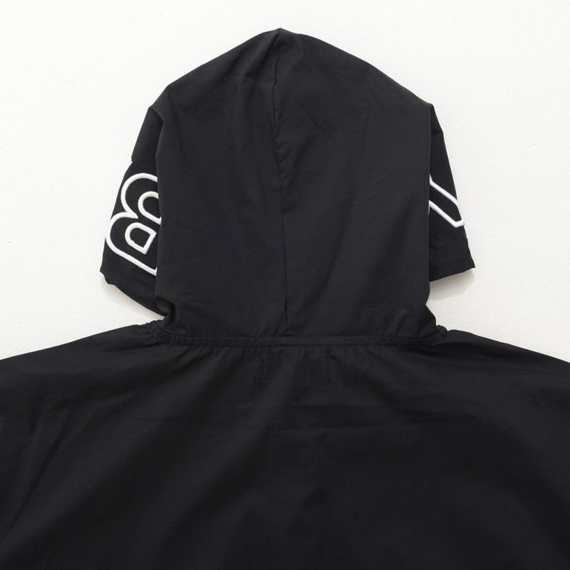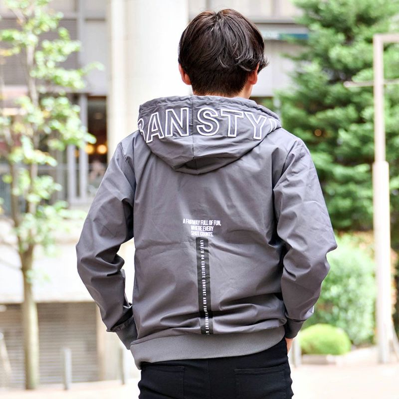 フロントはシンプルなワンポイントロゴ、フードやバックには大胆なロゴデザインを施し、都会的なモード感を演出。