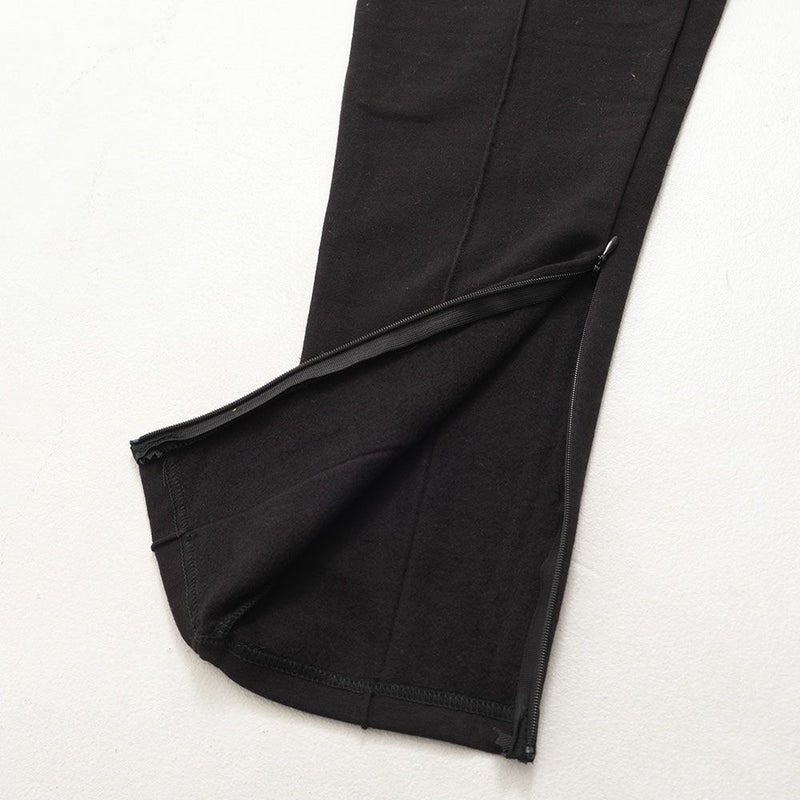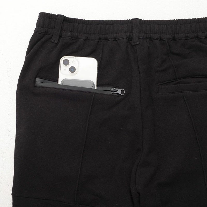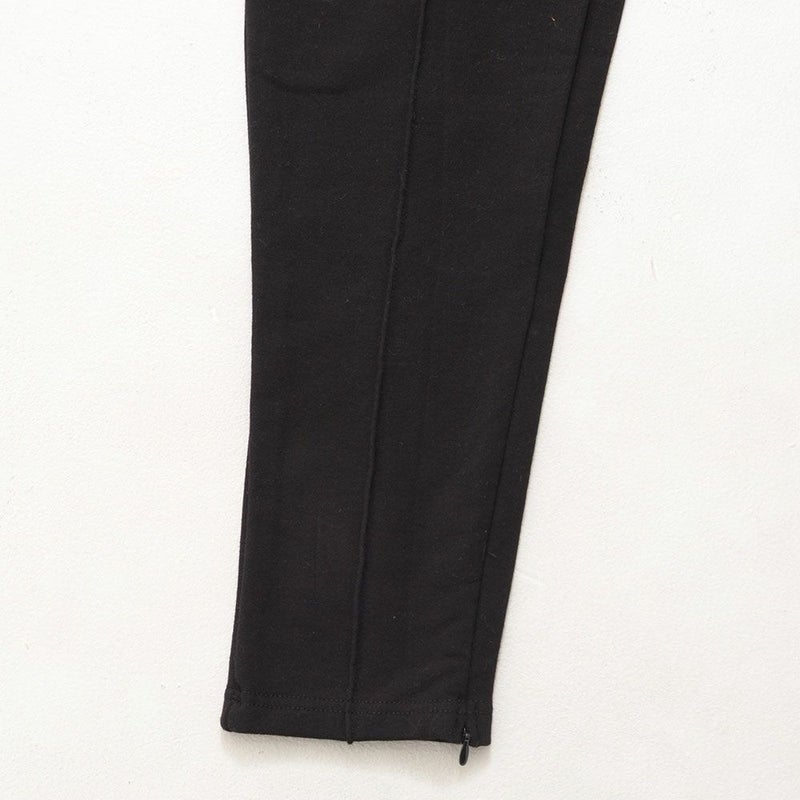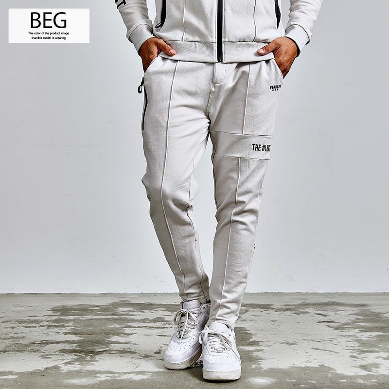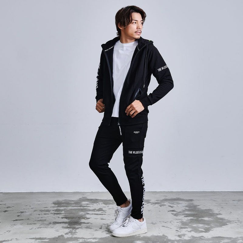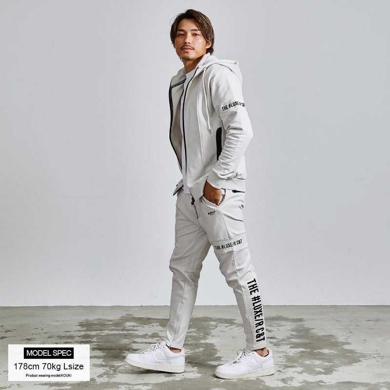 フロントや裾のジップや切替デザインがモードなアクセントとなり、サイドや脚後部に入ったロゴプリントがストリート感をプラス。