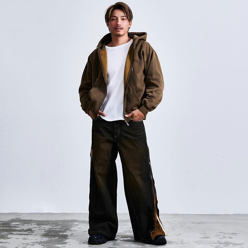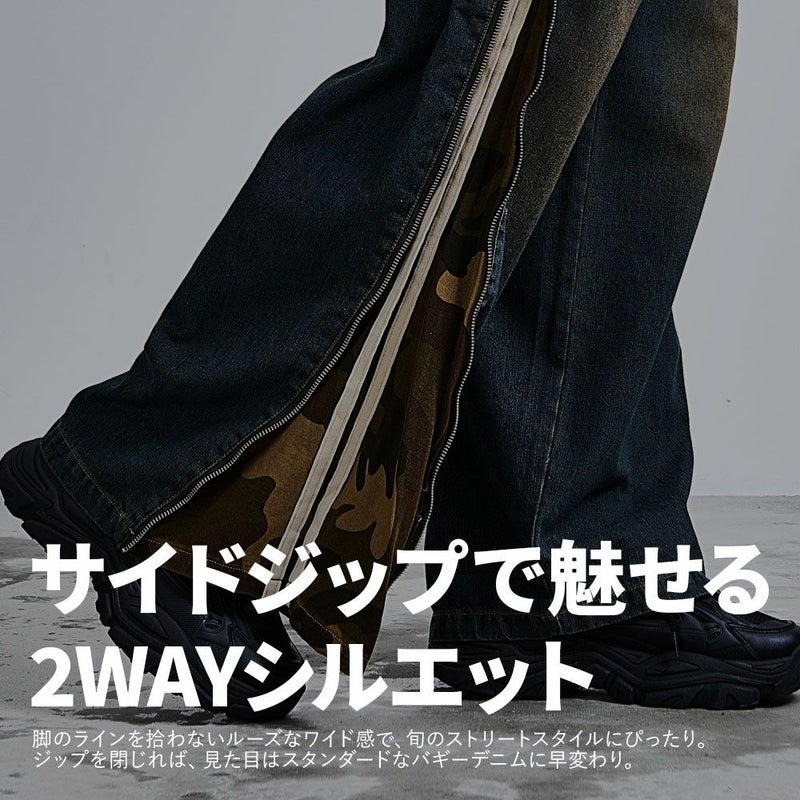 ジップを閉じれば、ベーシックなバギーデニムのように着用できる“2WAY仕様”で、気分やコーデに合わせて表情を変えられるギミックパンツです。
