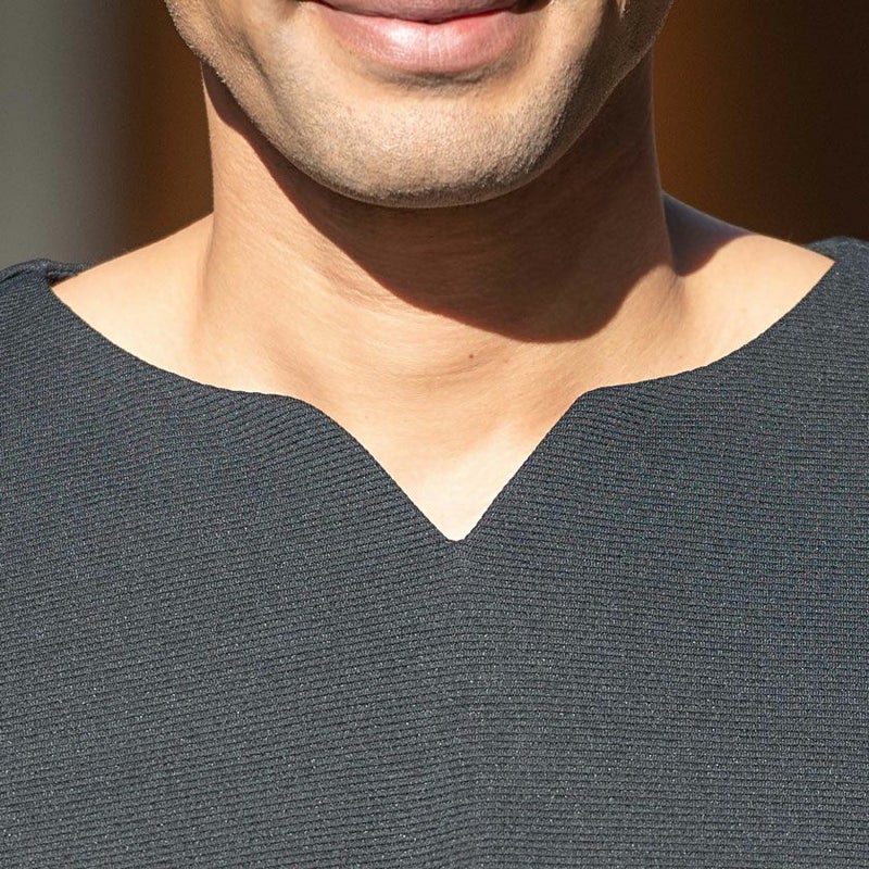 V字カットで顔周りがスッキリとした印象&爽やかな着こなしに仕上がります。