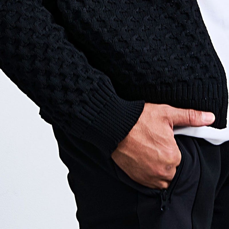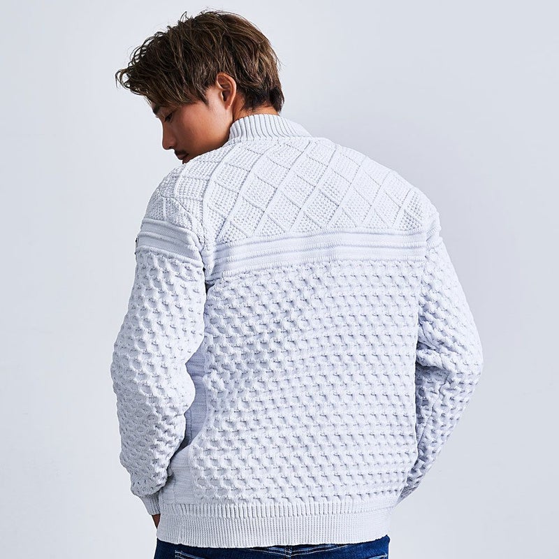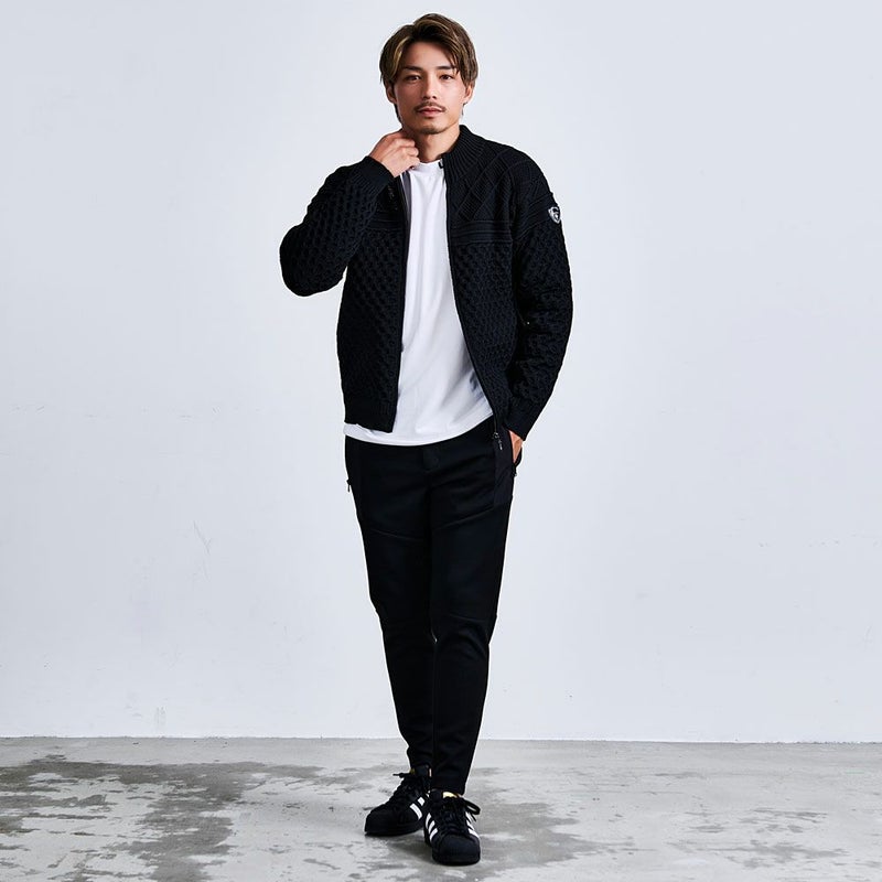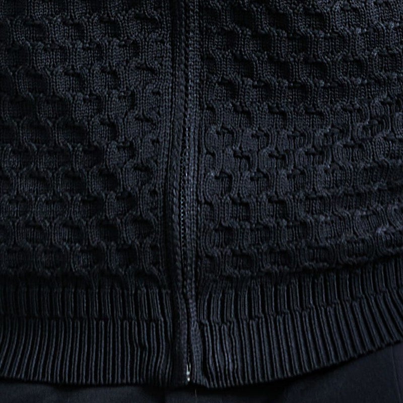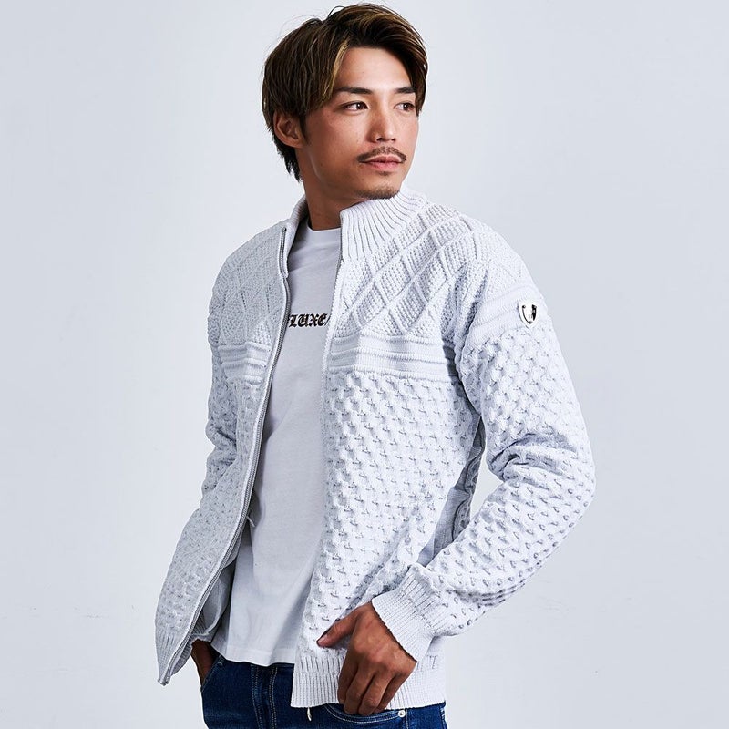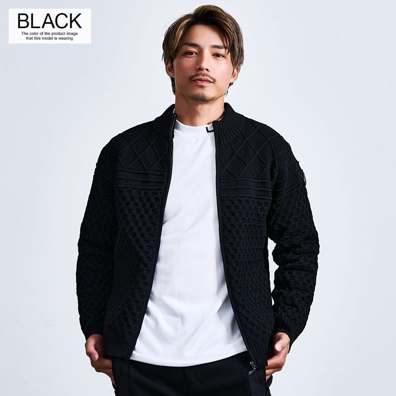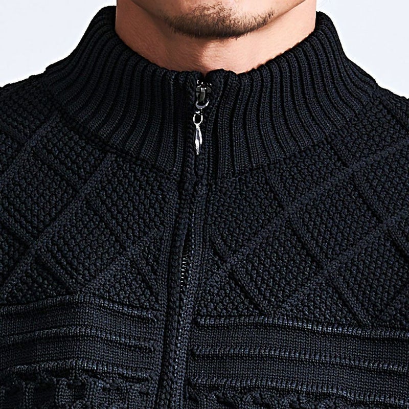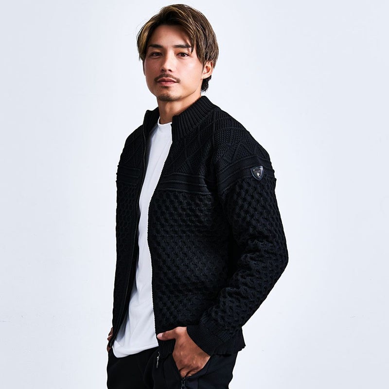 立体感のあるケーブル編みと品のあるジップアップデザインを組み合わせた贅沢仕様。