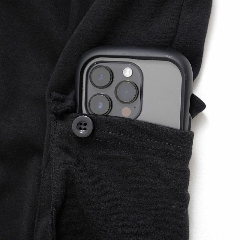 膝のカーゴポケットには釦が付き物が落ちるのを防いでくれます。