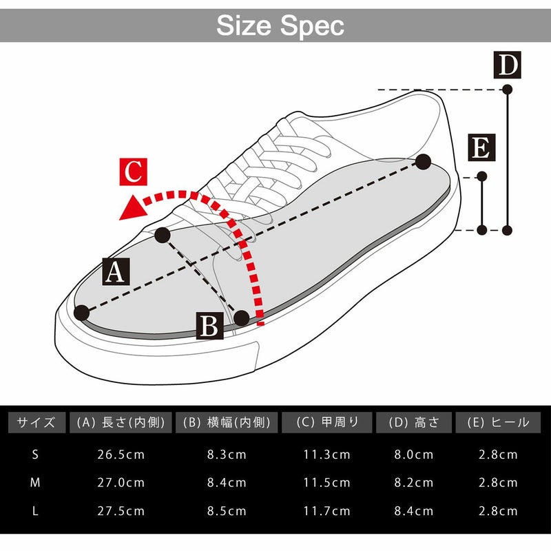 S(25.0-25.5cm):高さ8.0ソール高さ2.8長さ(内側)26.5横幅(内側)8.3 M(26.0-26.5cm):高さ8.2ソール高さ2.8長さ(内側)27.0横幅(内側)8.4 L(27.0-27.5cm):高さ8.4ソール高さ2.8長さ(内側)27.5横幅(内側)8.5 ※平置き計測。