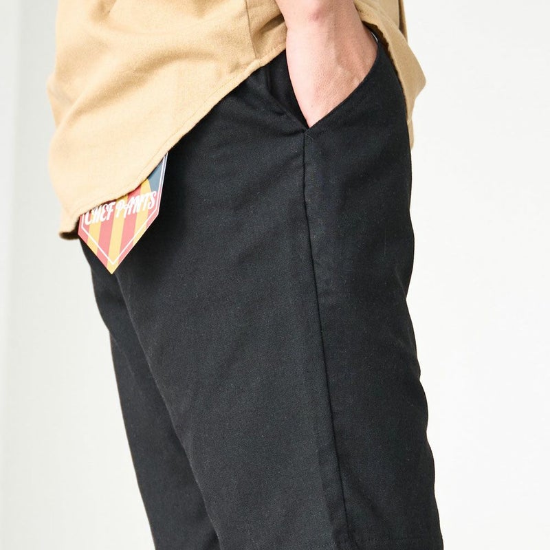 シルエットはややゆったりとした程よいワイド感で、脚まわりに適度な余裕を持たせたリラックスフィット。シンプルなデザインながらも、ウエストはゴム+ドローコード仕様で実用性も兼ね備え、ストレスフリーな穿き心地を実現しています。