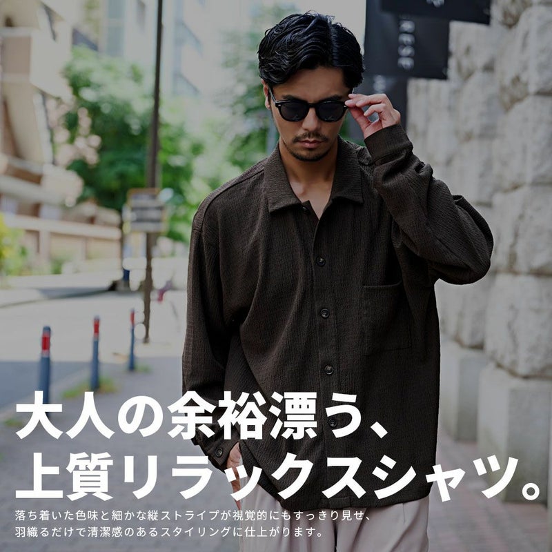 落ち着いた色味と細かな縦ストライプが視覚的にもすっきり見せ、羽織るだけで清潔感のあるスタイリングに仕上がります。