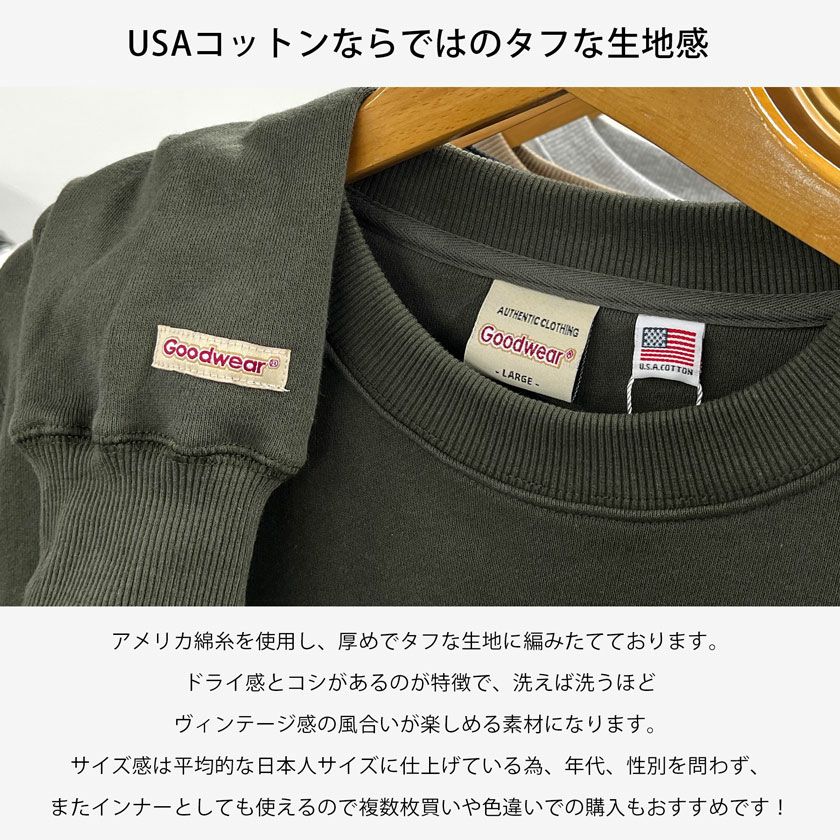 他の画像を見る トレーナー メンズ スウェット Goodwear グッドウェア トップス USAコットン スエット カジュアル ヘビーウェイト コットン 厚手 トップス インナー 無地 定番 アメカジ ファッション Goodwear(グッドウェア)USAコットンクルーネック長袖裏毛トレーナー/全9色 販売価格 ¥ 6,490 税込 カートに入れる お気に入りに登録する