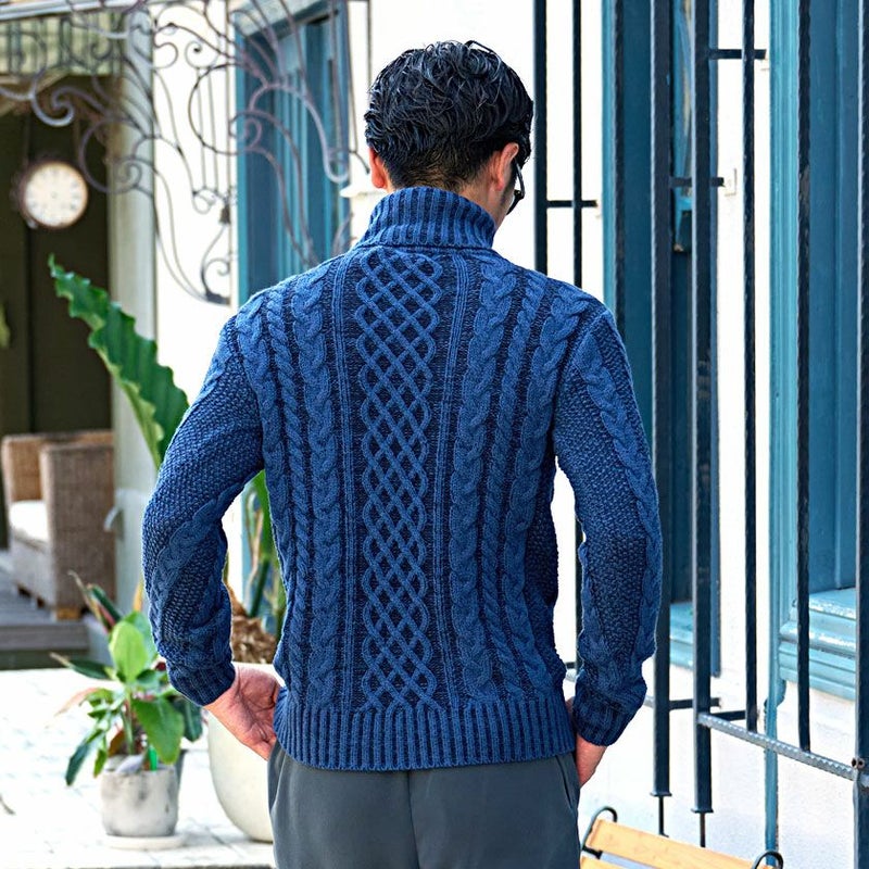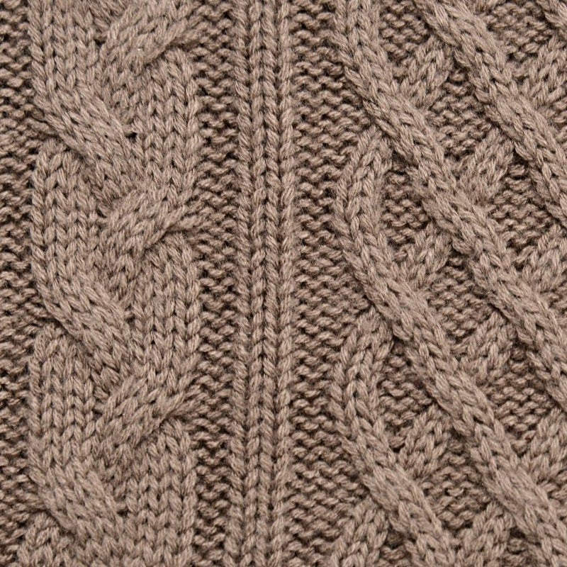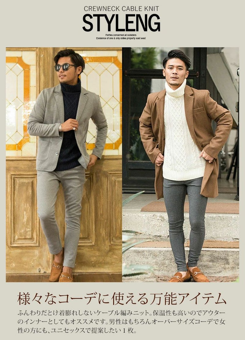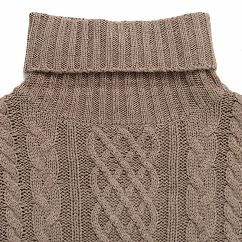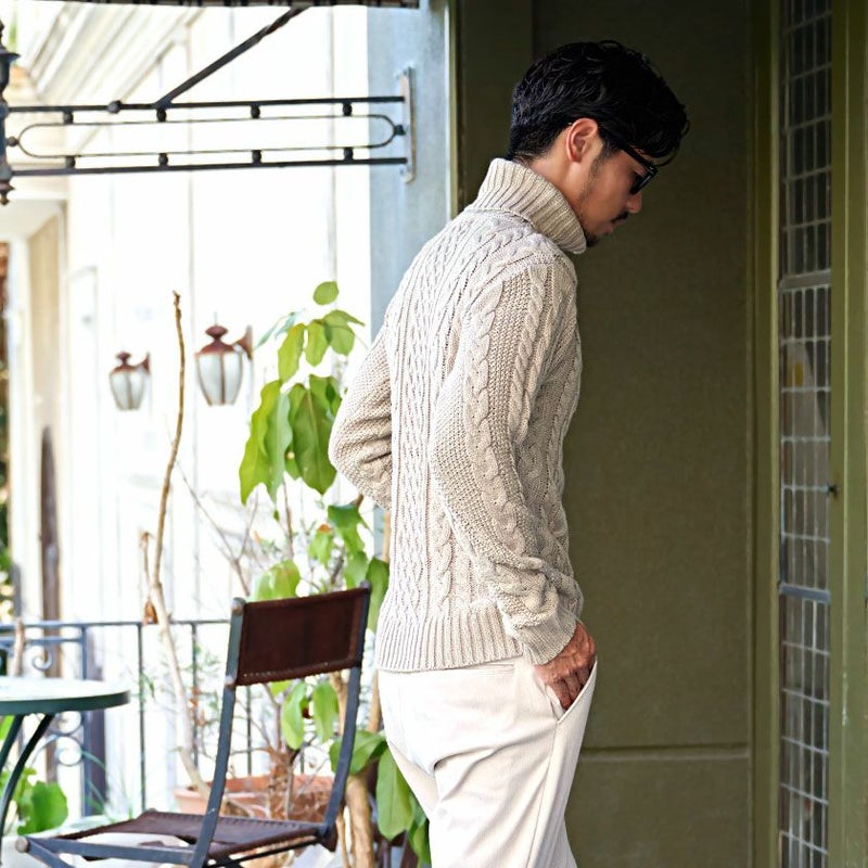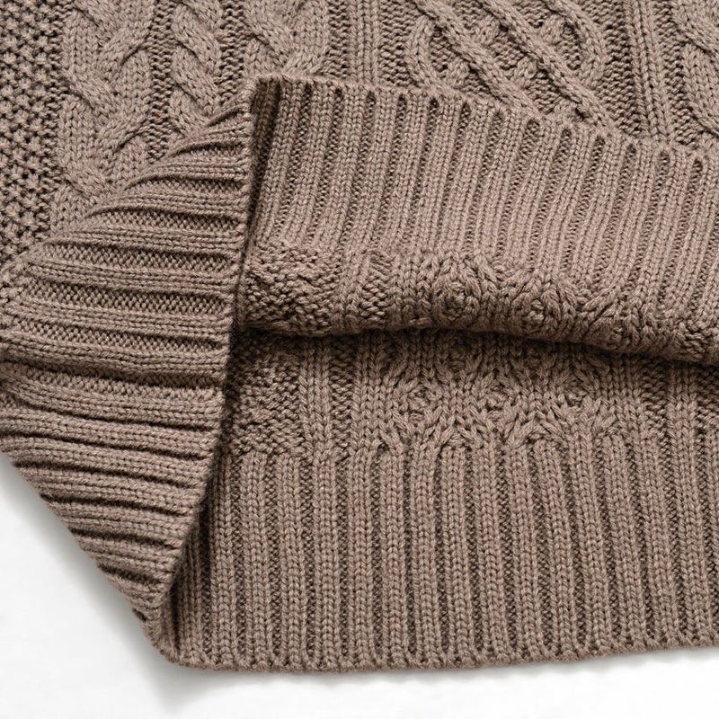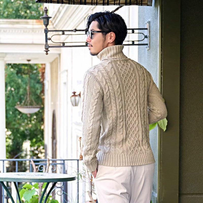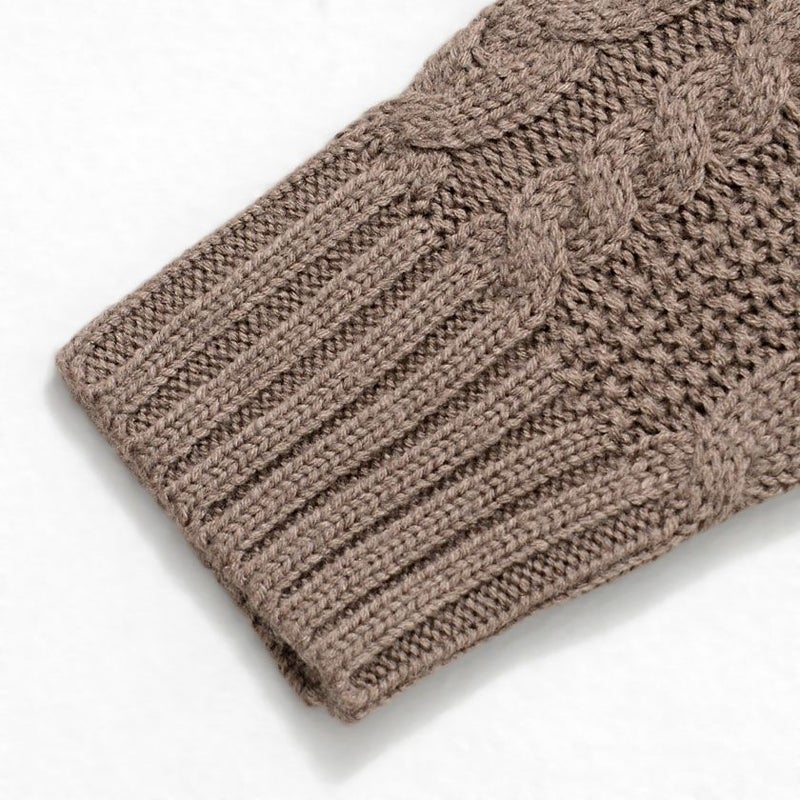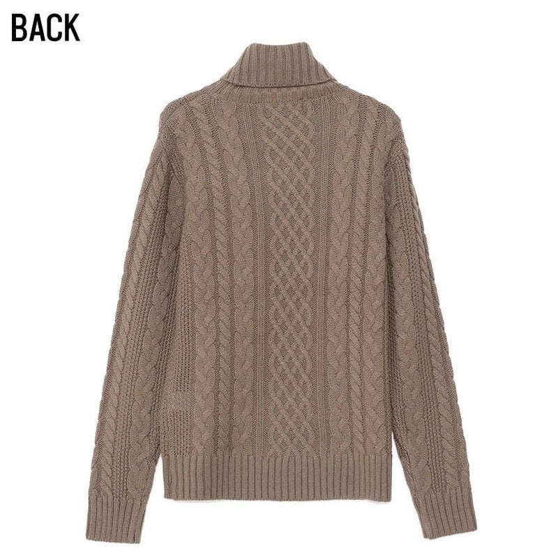 立体感のあるケーブル編み模様は、まるで三つ編みのように縦ラインを強調し、着るだけで存在感のある一枚に。