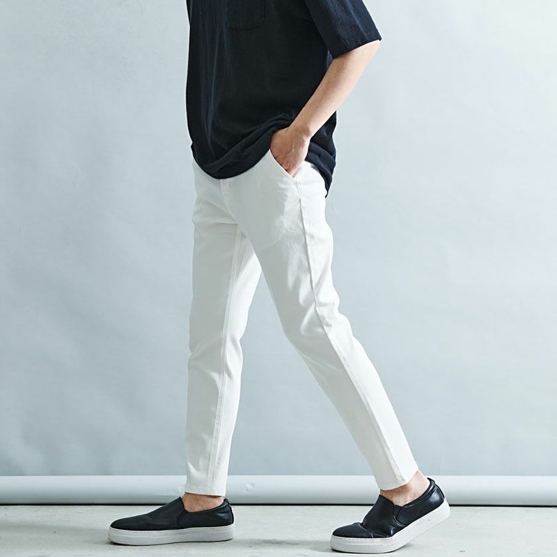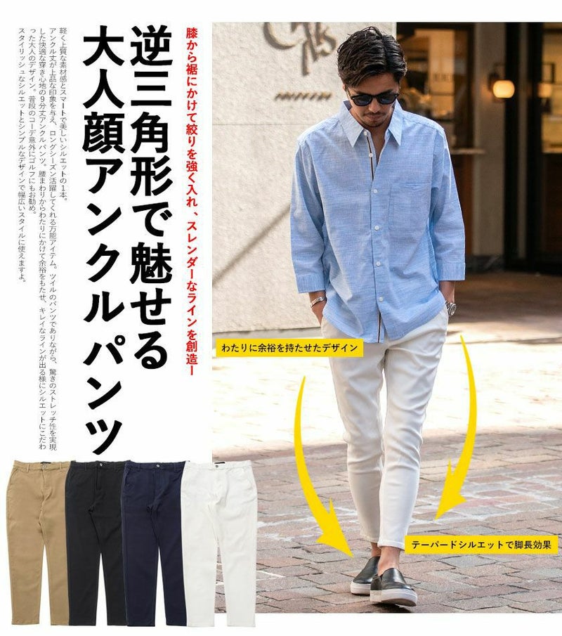 ツイルのパンツでありながら、伸縮性の高い驚きのストレッチ性を実現した快適な穿き心地の9分丈アンクルパンツ。