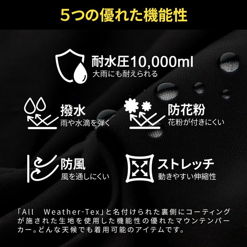 「耐水圧」「撥水」「防花粉」「防風」「ストレッチ」の5つの機能を兼ね備え、あらゆる環境に対応できる一着です。