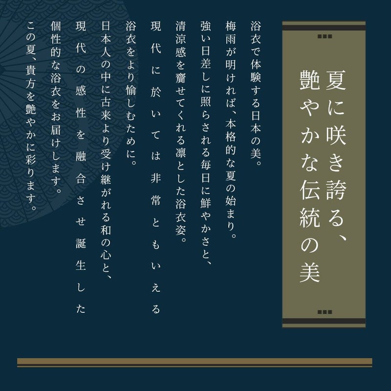 落ち着いた佇まいの中に粋を感じさせる一着は、夏の思い出をより上質なものへと引き立ててくれます。