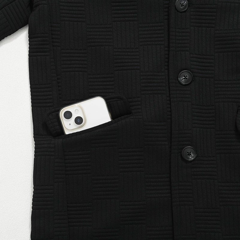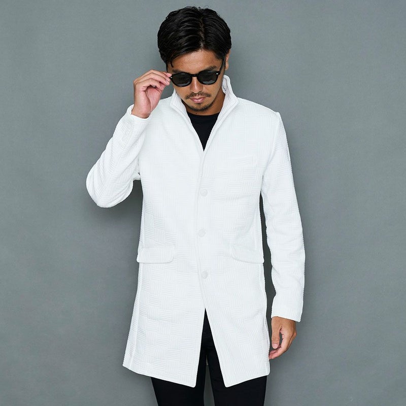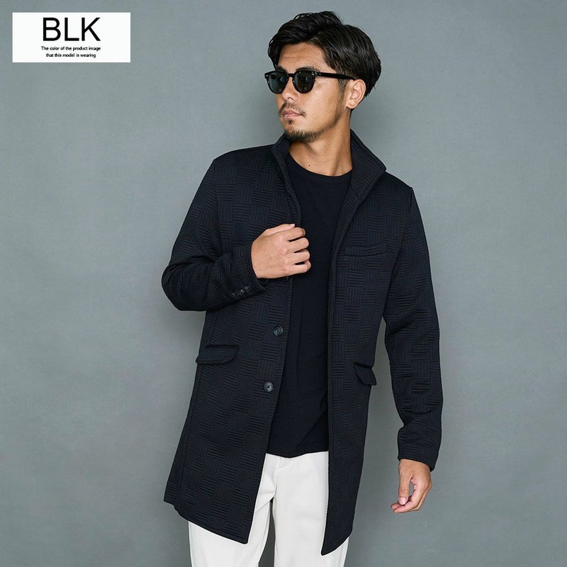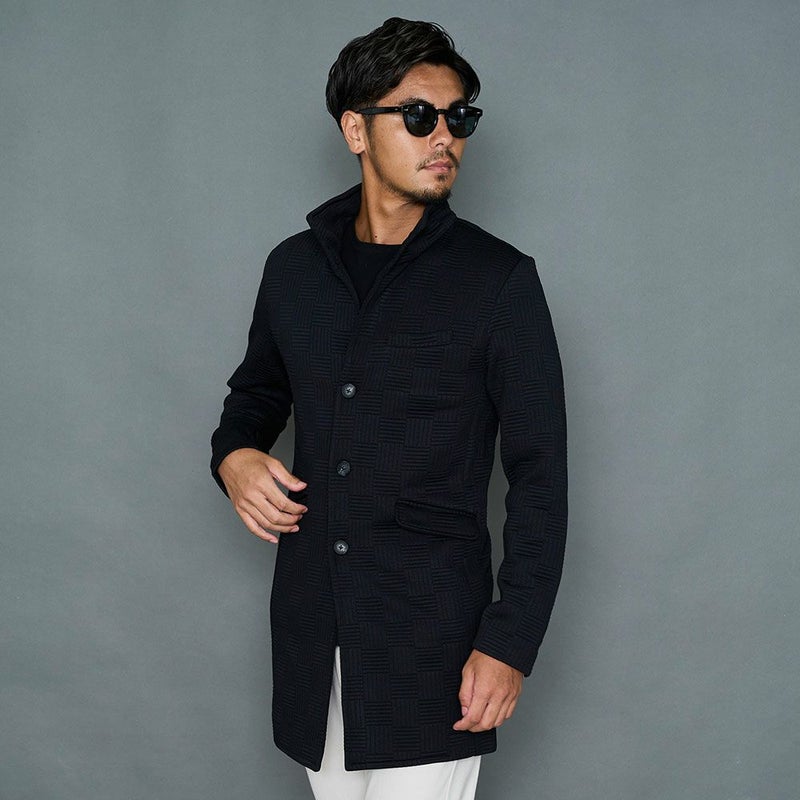 凹凸のあるキルティングのバスケットチェック柄デザインが印象的なロングコート。