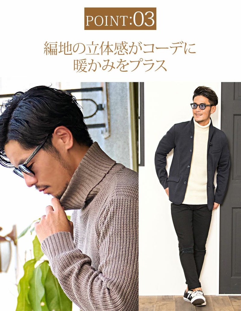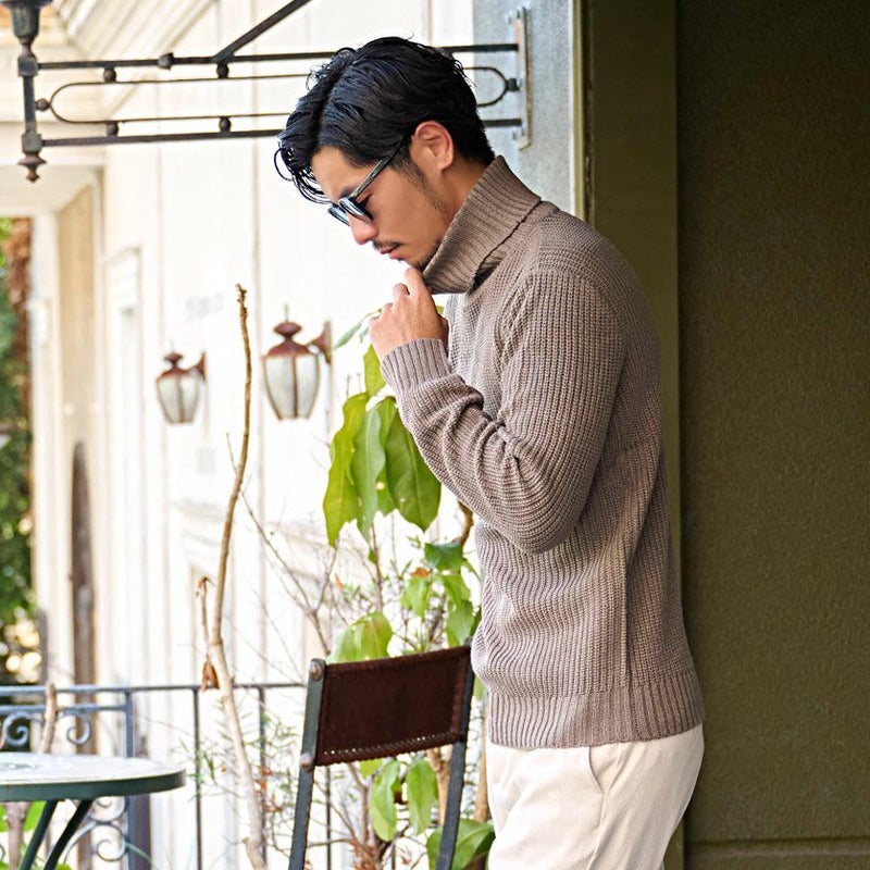 ネックラインはややボリュームのあるタートルネック仕様で、首元までしっかり暖かく、上品で落ち着いた大人の雰囲気を演出。