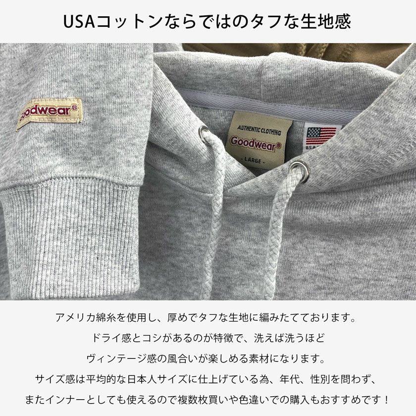他の画像を見る パーカー メンズ スウェット Goodwear グッドウェア トップス USAコットン スエット プルパーカー フーディー カジュアル ヘビーウェイト コットン 厚手 トップス インナー 無地 定番 Goodwear(グッドウェア)USAコットン裏毛プルパーカー/全9色 販売価格 ¥ 8,250 税込 カートに入れる お気に入りに登録する
