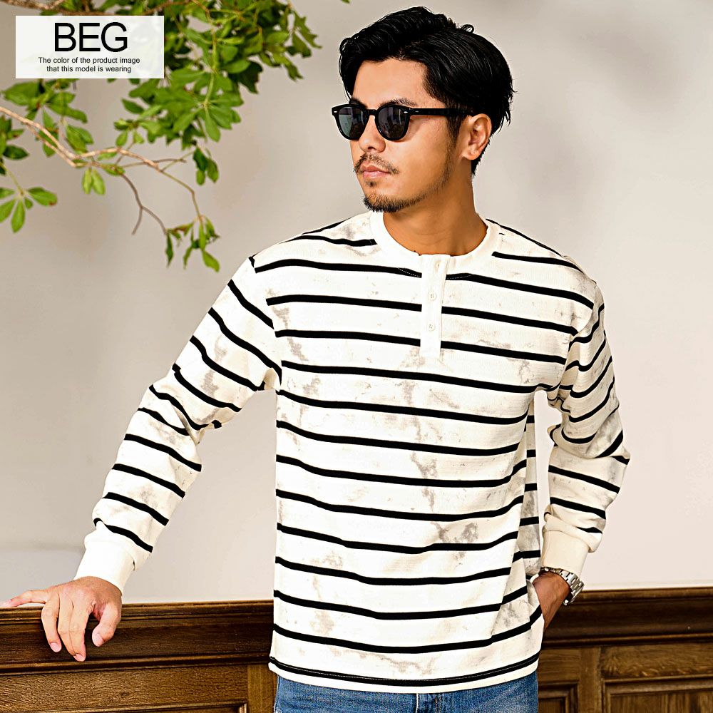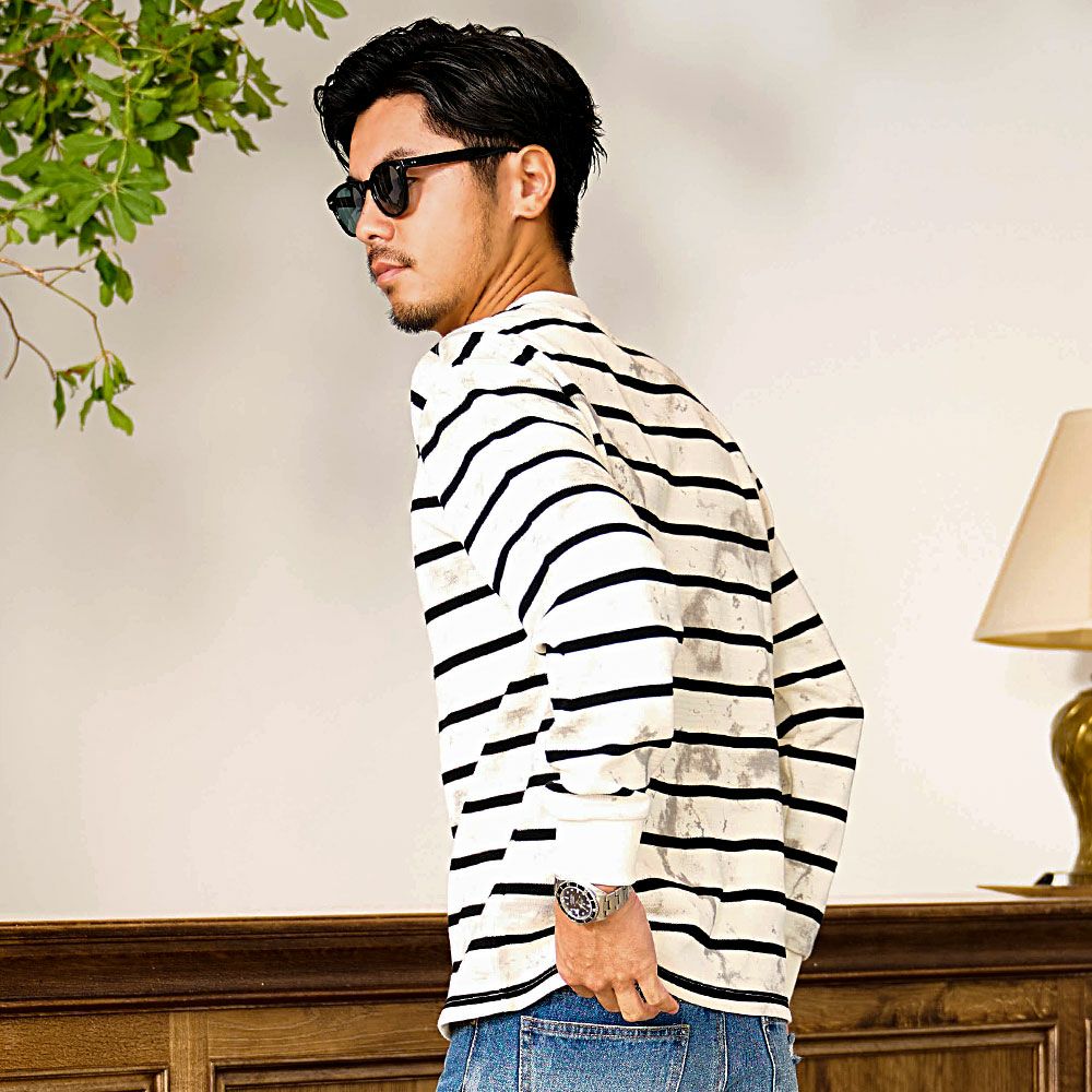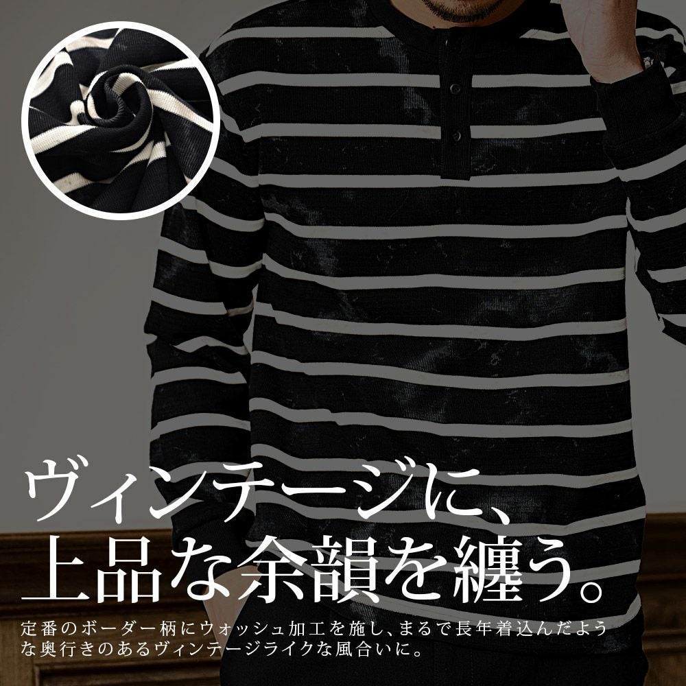 他の画像を見る クラシカルなヘンリーネック×絶妙なかすれ感。ヴィンテージライクな風合いを楽しむボーダーロンT。 BENUSTA(ベヌスタ)汚し加工ボーダーヘンリーネック長袖Tシャツ/全2色 販売価格 ¥ 6,490 税込 カートに入れる お気に入りに登録する