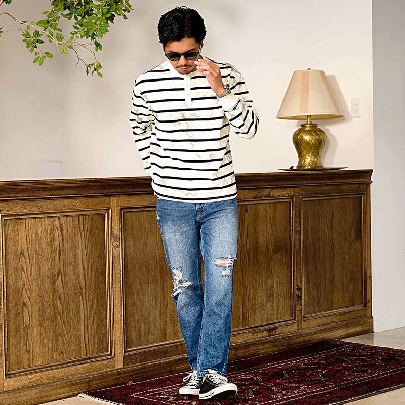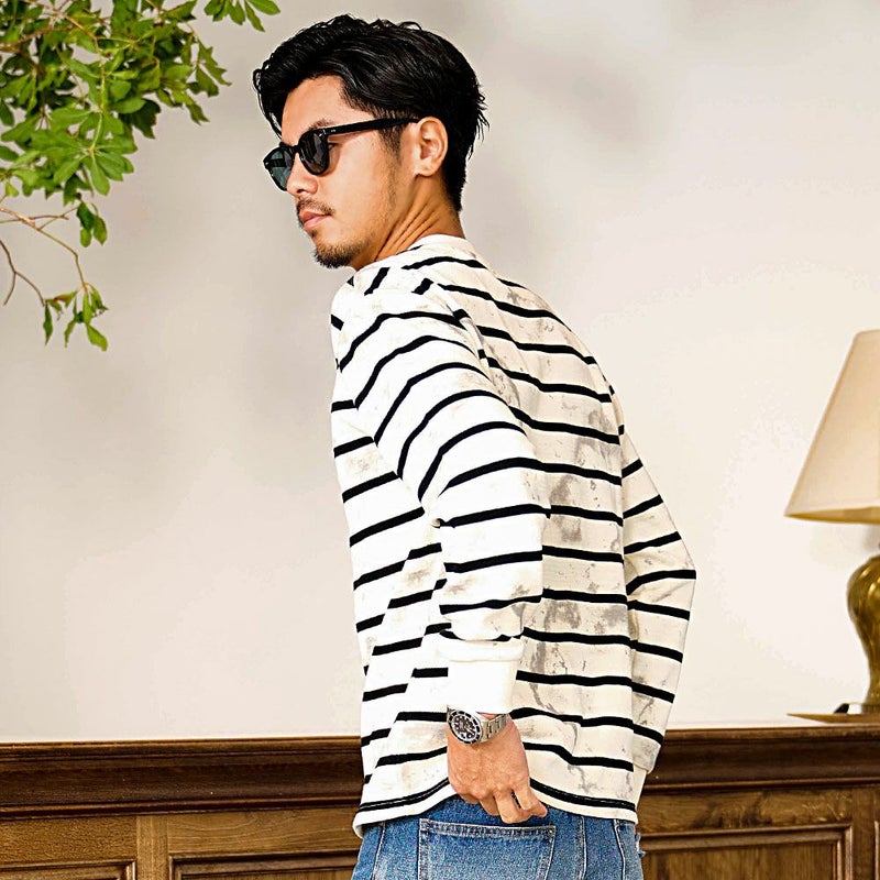 定番のボーダー柄にウォッシュ加工を施し、まるで長年着込んだような奥行きのあるヴィンテージライクな風合いに。