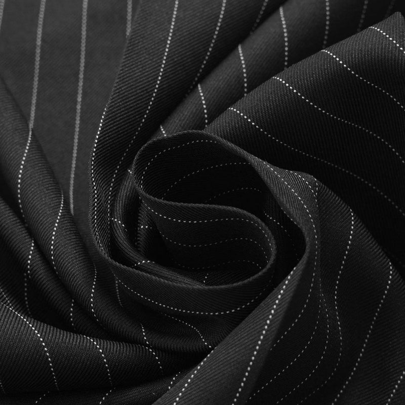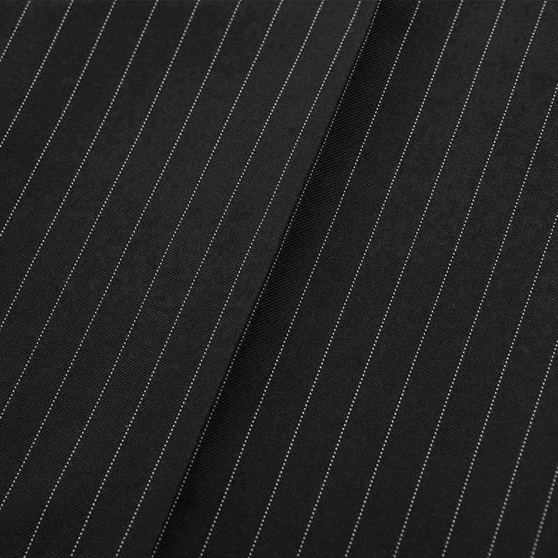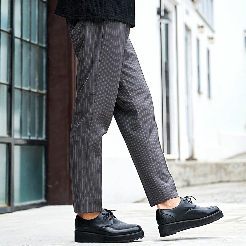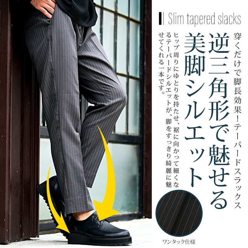 上品な光沢と滑らかな肌触りが高級感溢れるストライプ柄のスラックス。