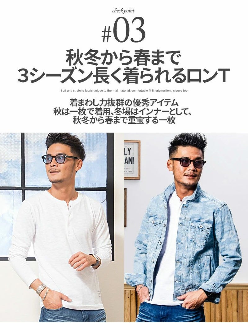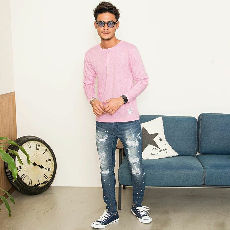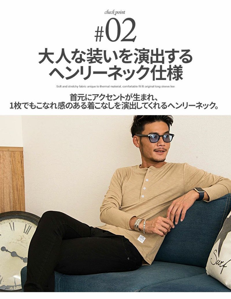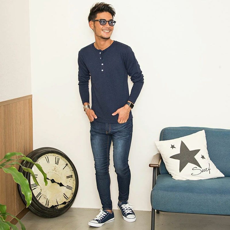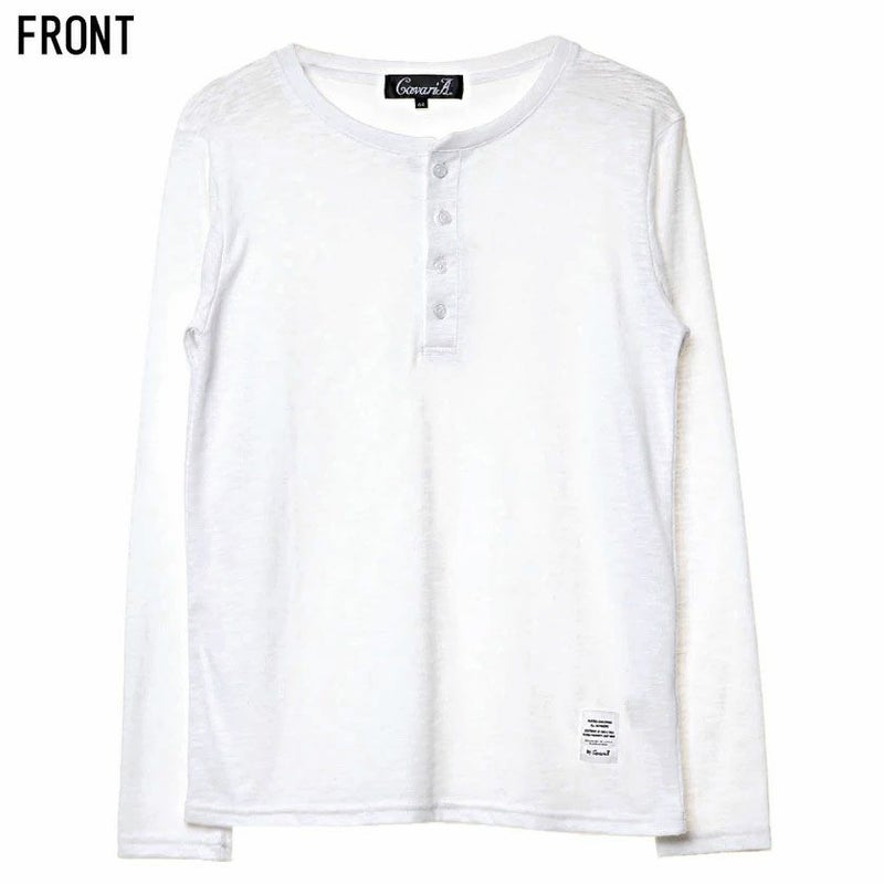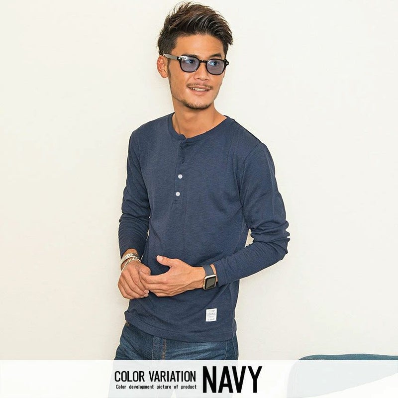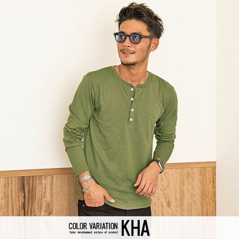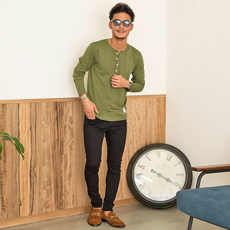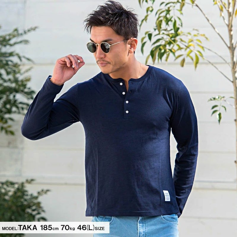 首元はヘンリーネック仕様なので、ボタンの開け具合でアレンジが楽しめるのが強み。