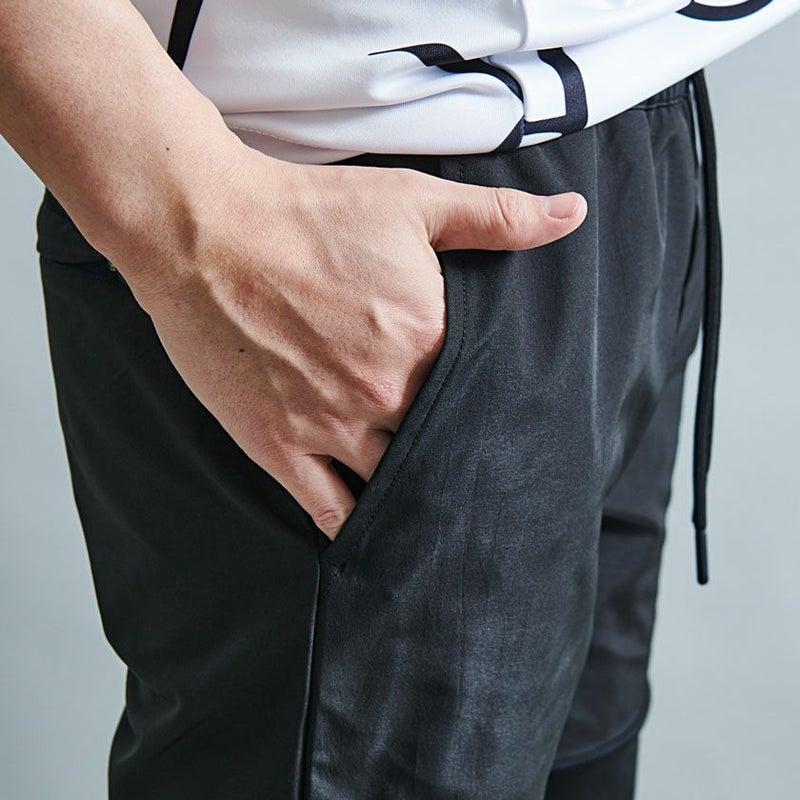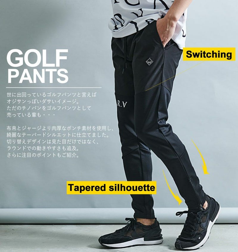 今回のゴルフパンツはジャージより肉厚なポンチ素材を使用し、綺麗なテーパードシルエットに仕立てました。