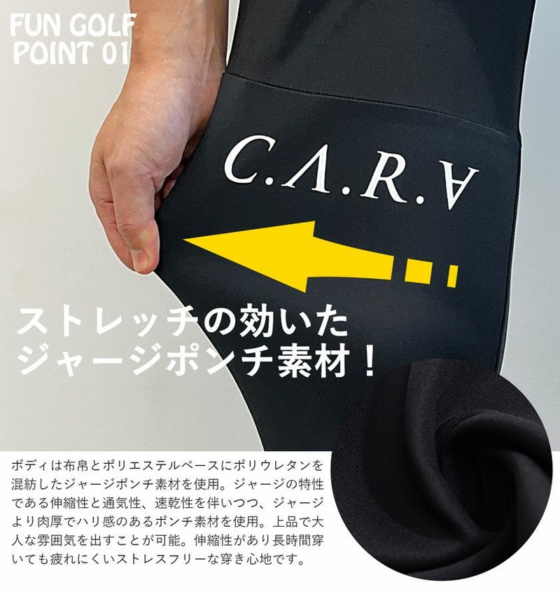 ジャージの特性である伸縮性と通気性、速乾性を伴いつつ、ジャージより肉厚でハリ感のあるポンチ素材を使用。