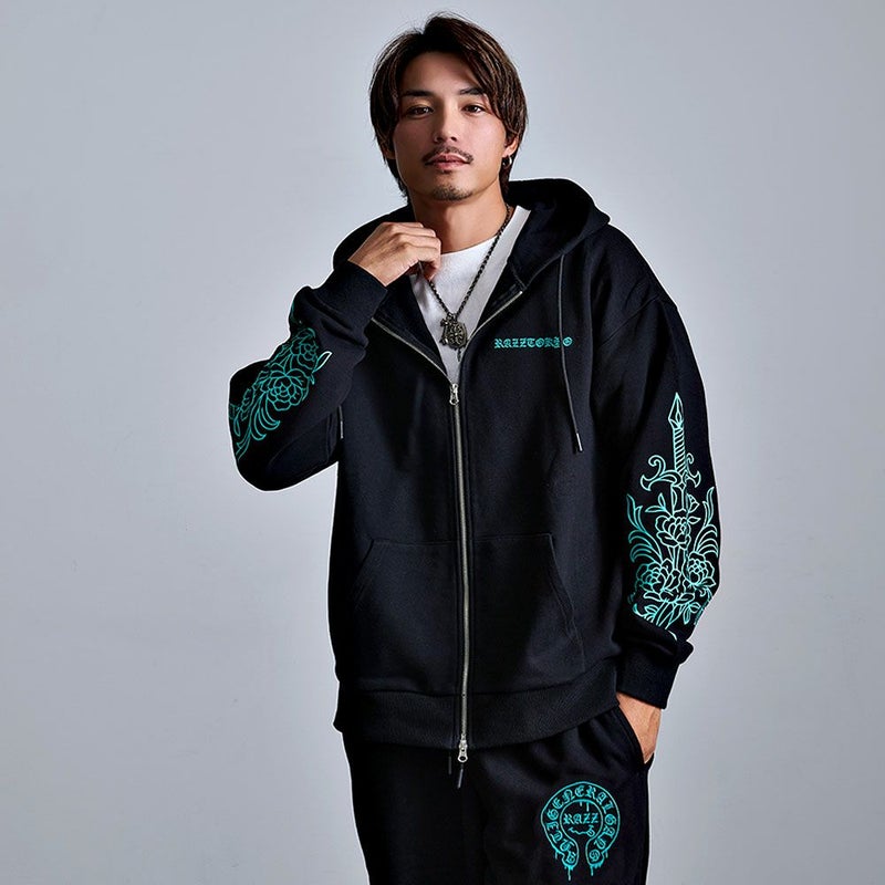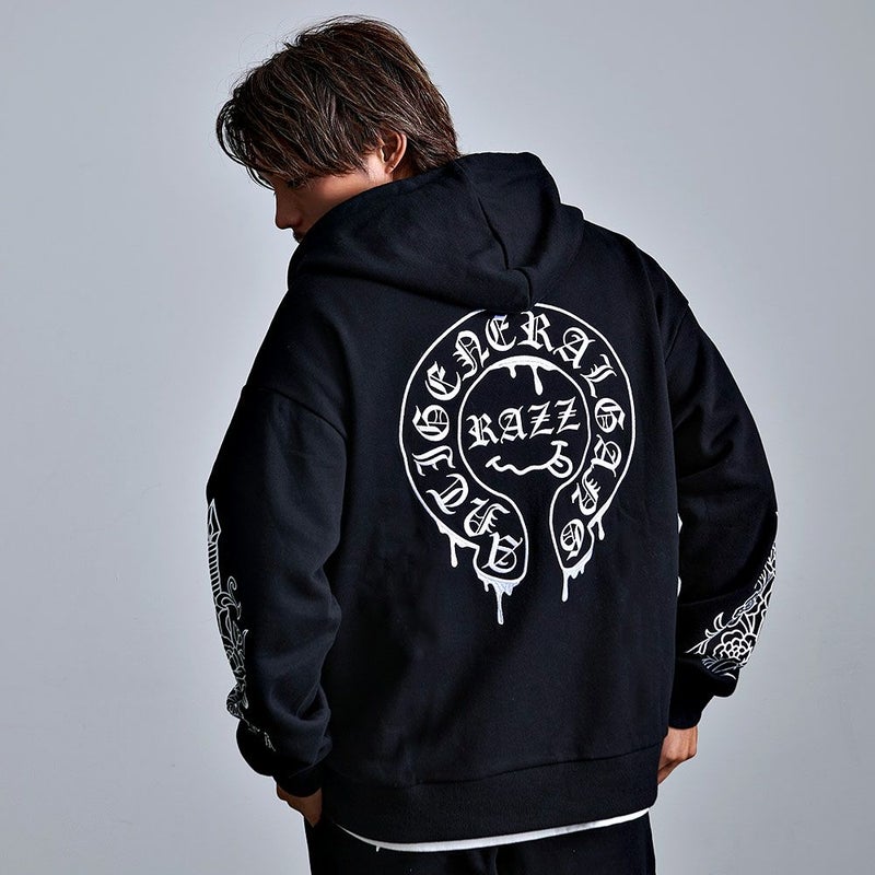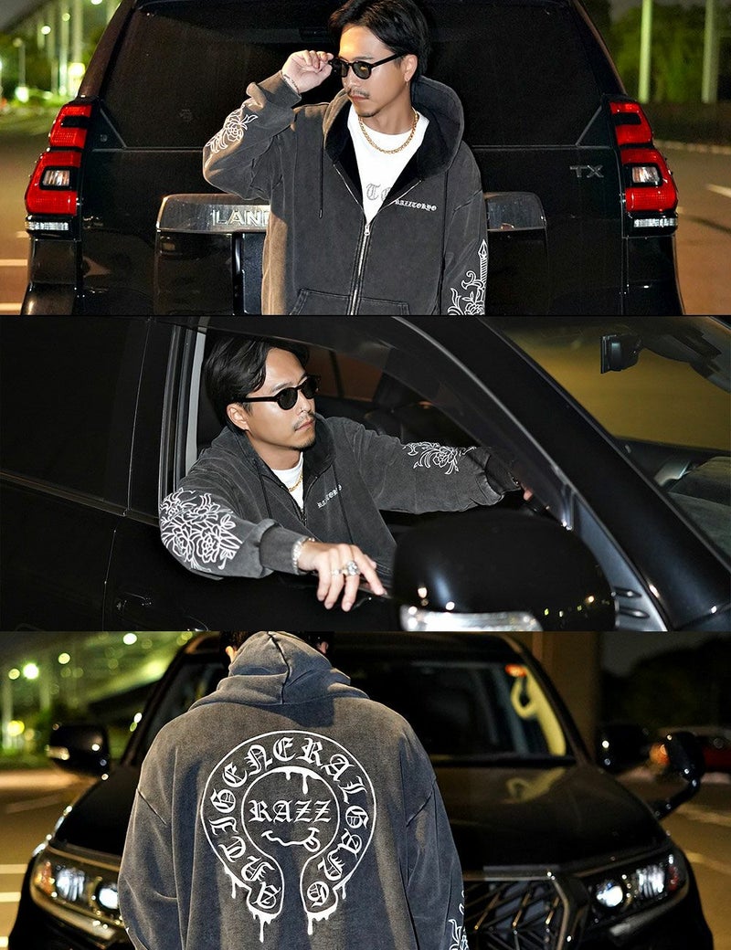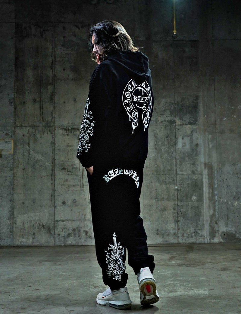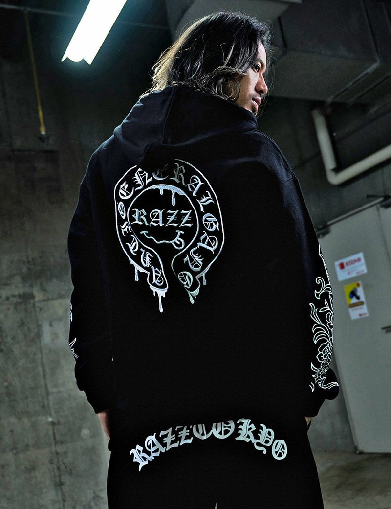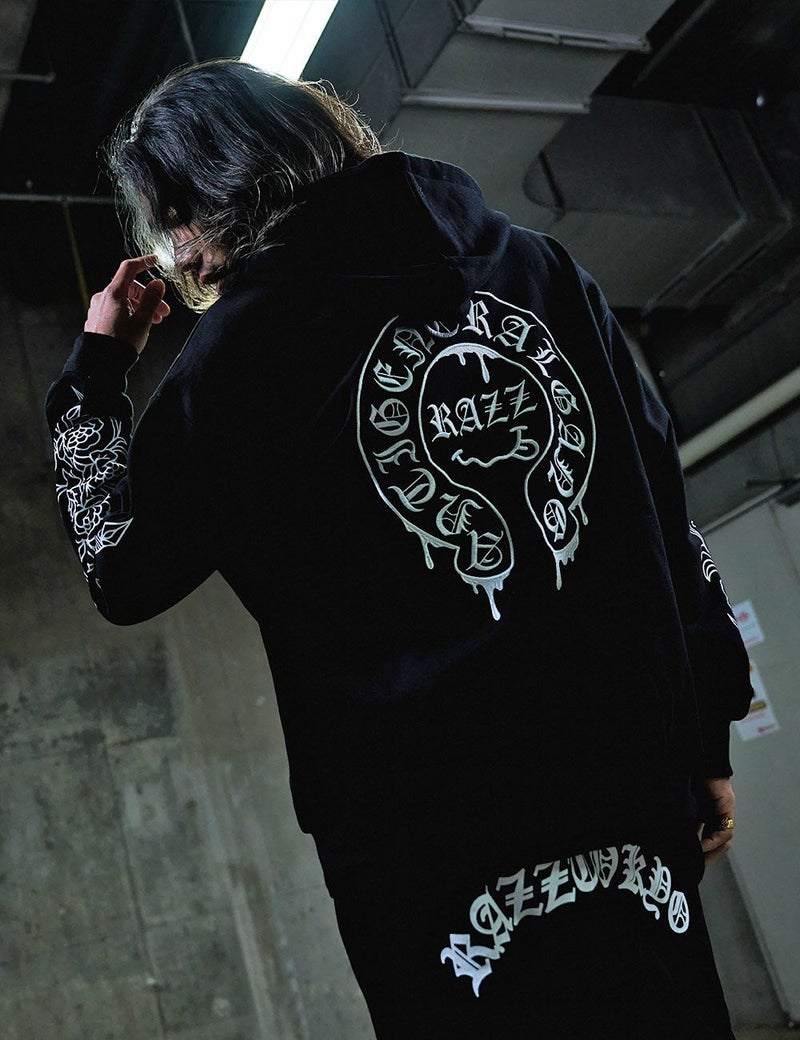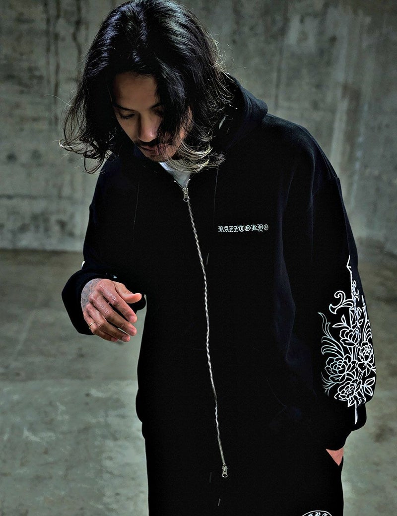 袖にはダガーと薔薇を組み合わせたRAZZISオリジナルモチーフをプリントで配置し、直線と曲線が交差するグラフィックがストリートらしいエッジをプラス。