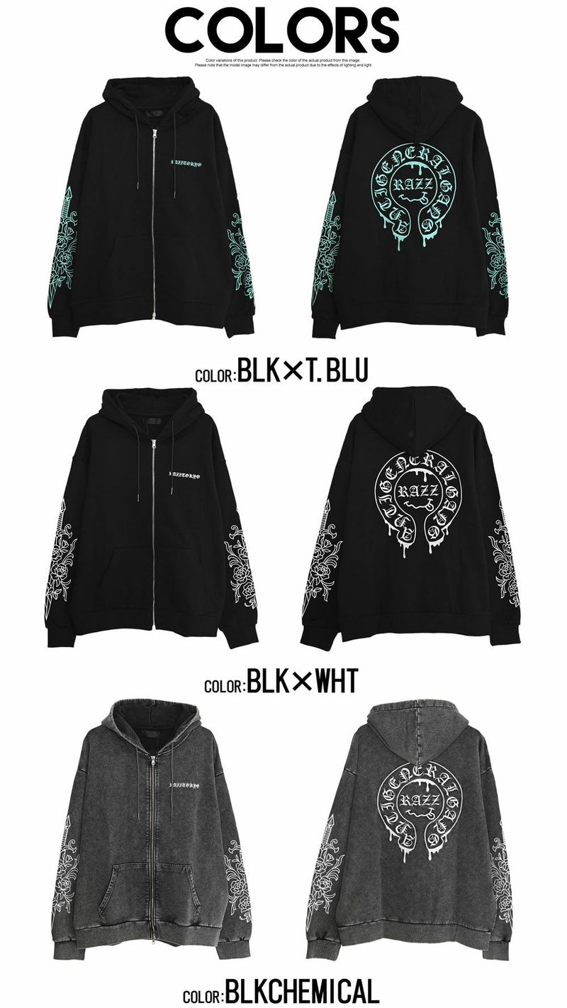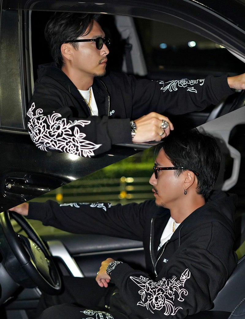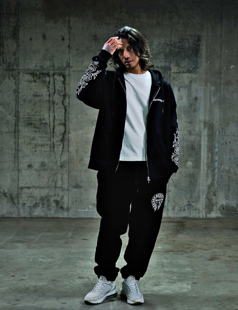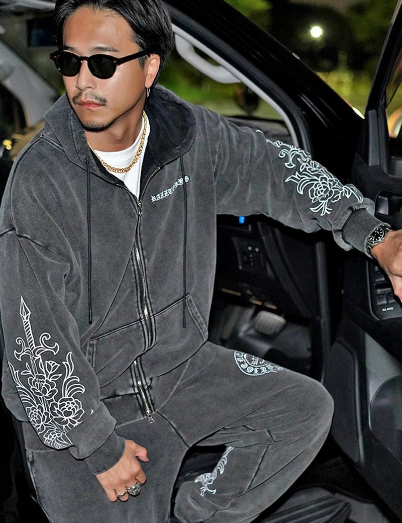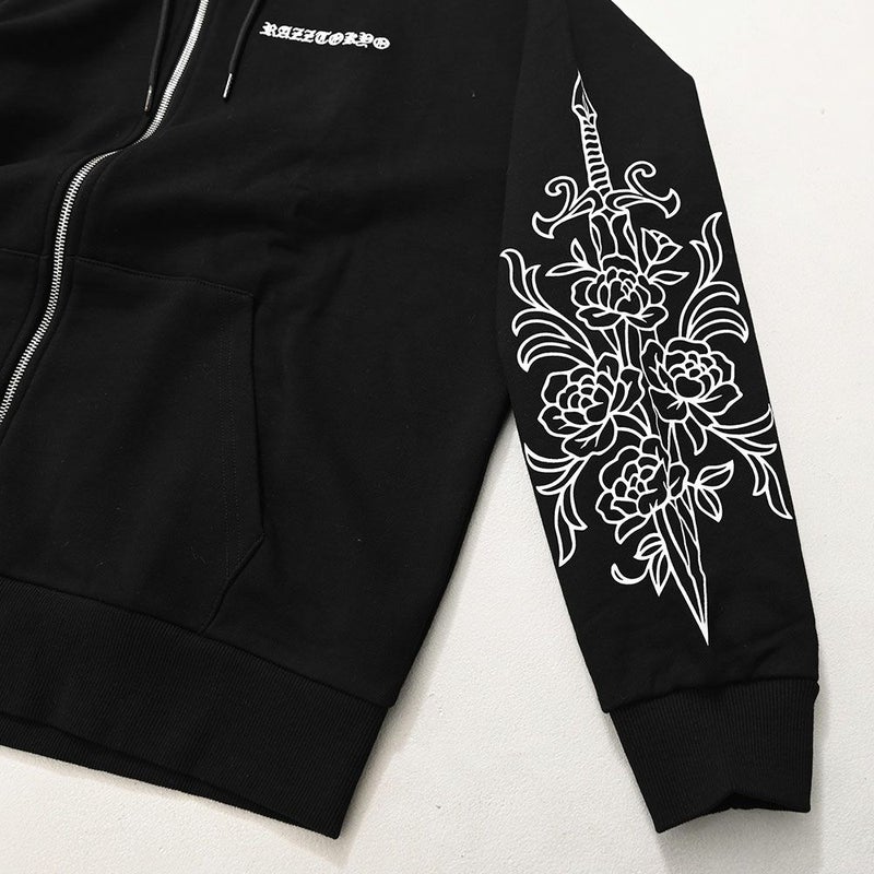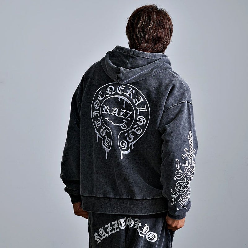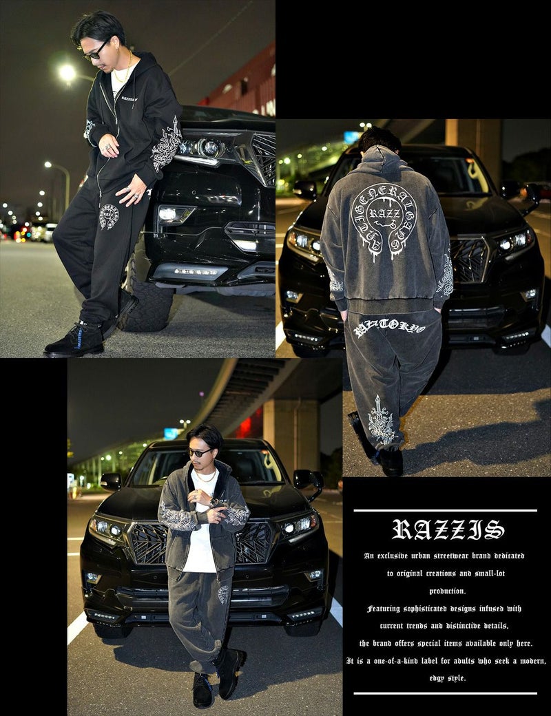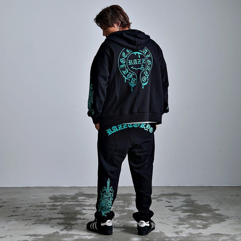 袖にはダガーと薔薇を組み合わせたRAZZISオリジナルモチーフをプリントで配置し、直線と曲線が交差するグラフィックがストリートらしいエッジをプラス。