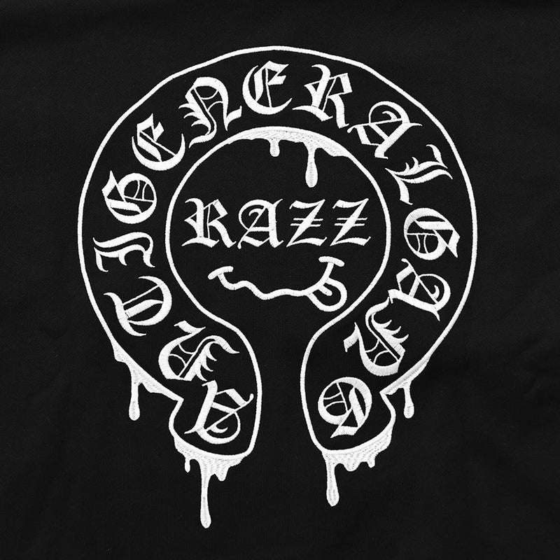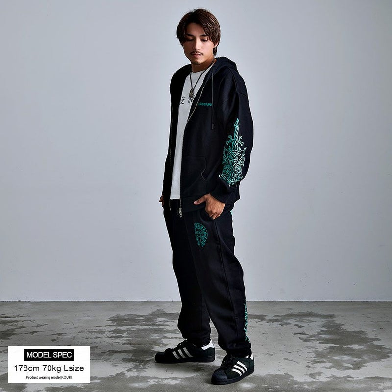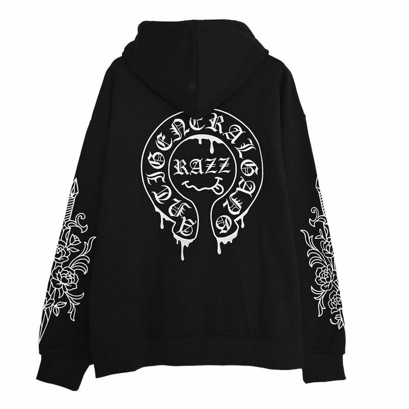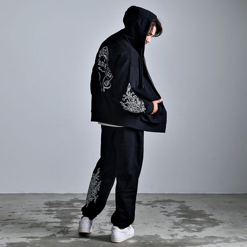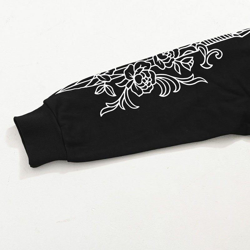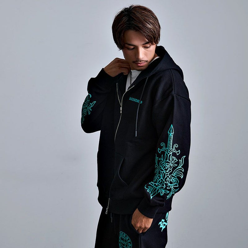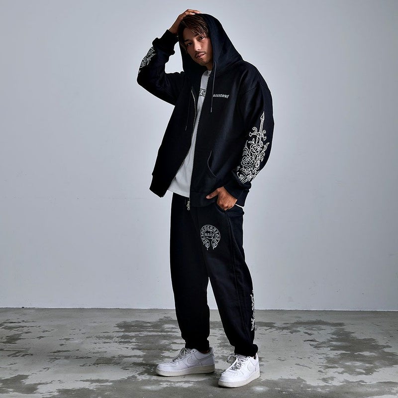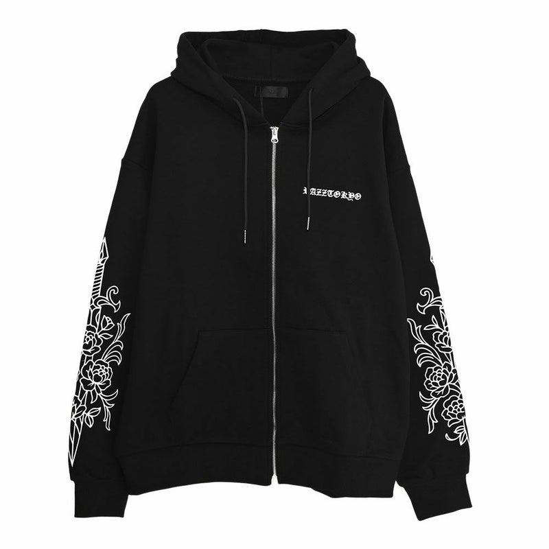 袖にはダガーと薔薇を組み合わせたRAZZISオリジナルモチーフをプリントで配置し、直線と曲線が交差するグラフィックがストリートらしいエッジをプラス。