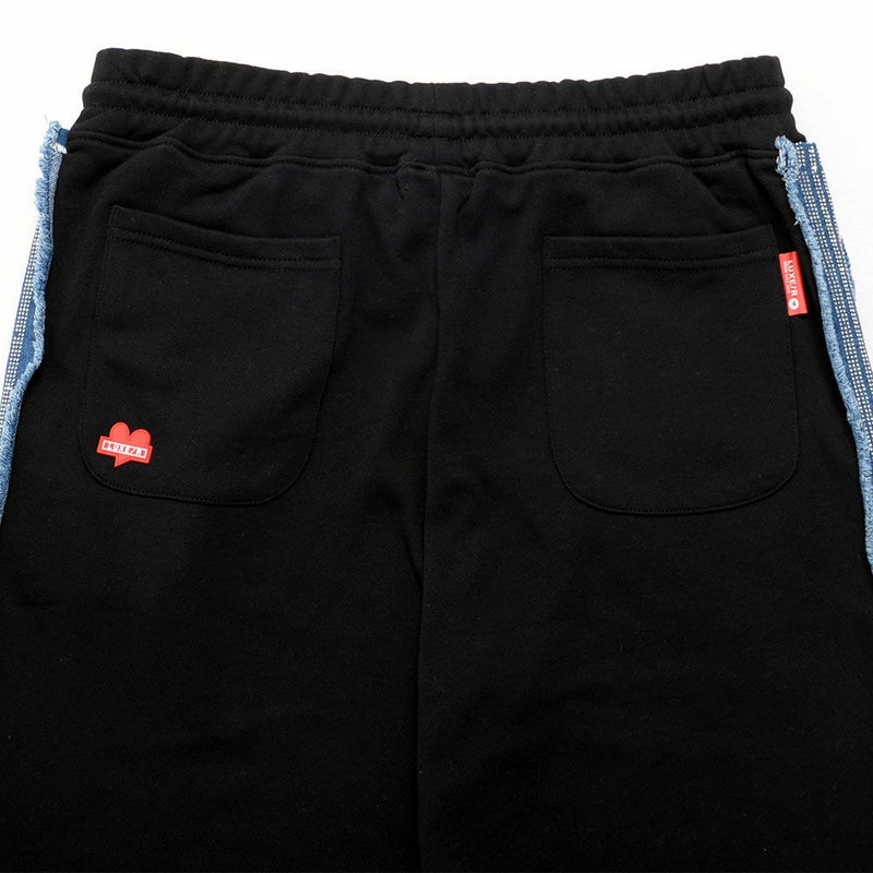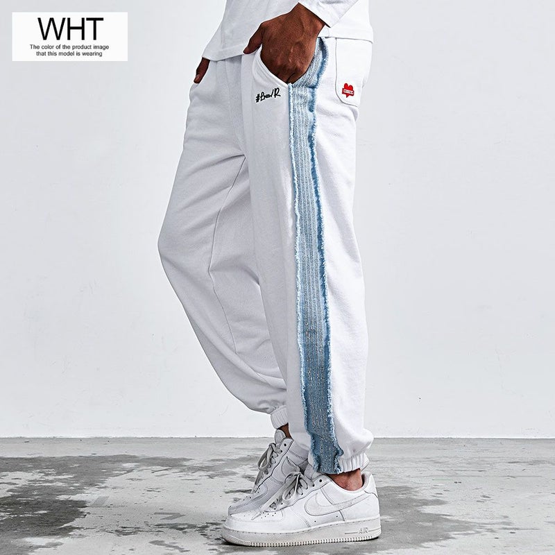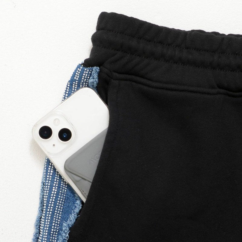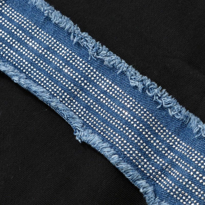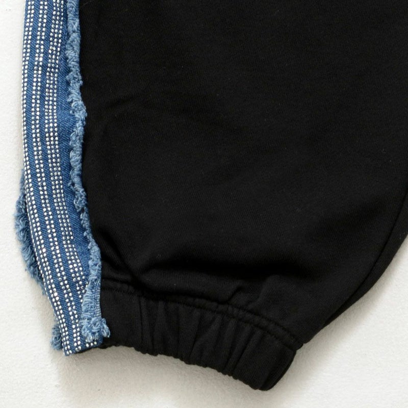 柔らかなスウェット素材に、サイドにデニムパーツを貼り付け、その上にラインストーンを丁寧に配置。