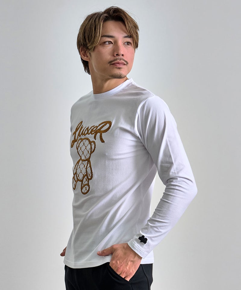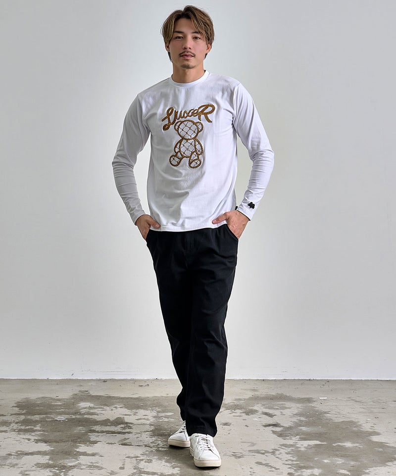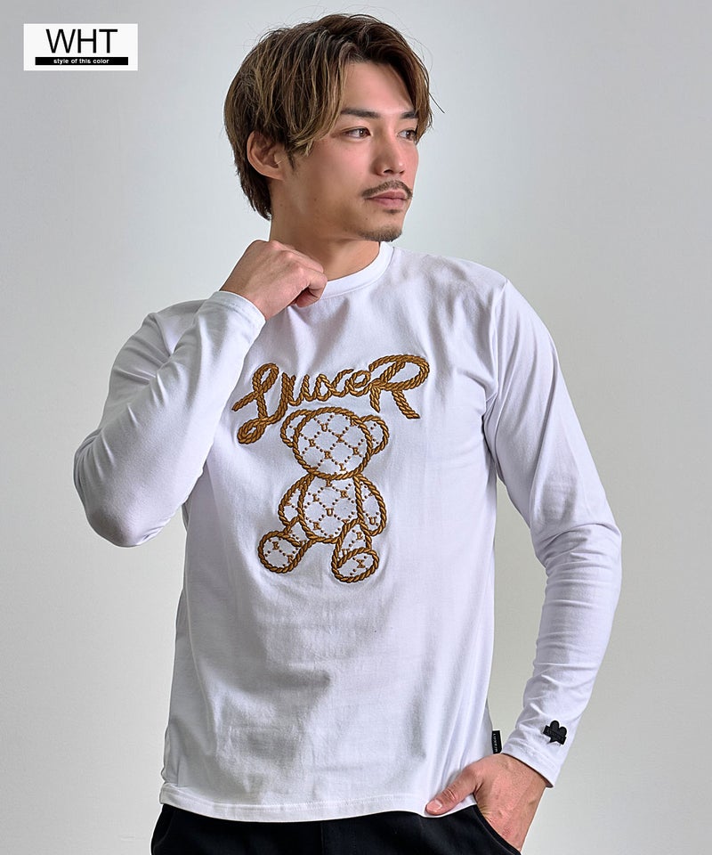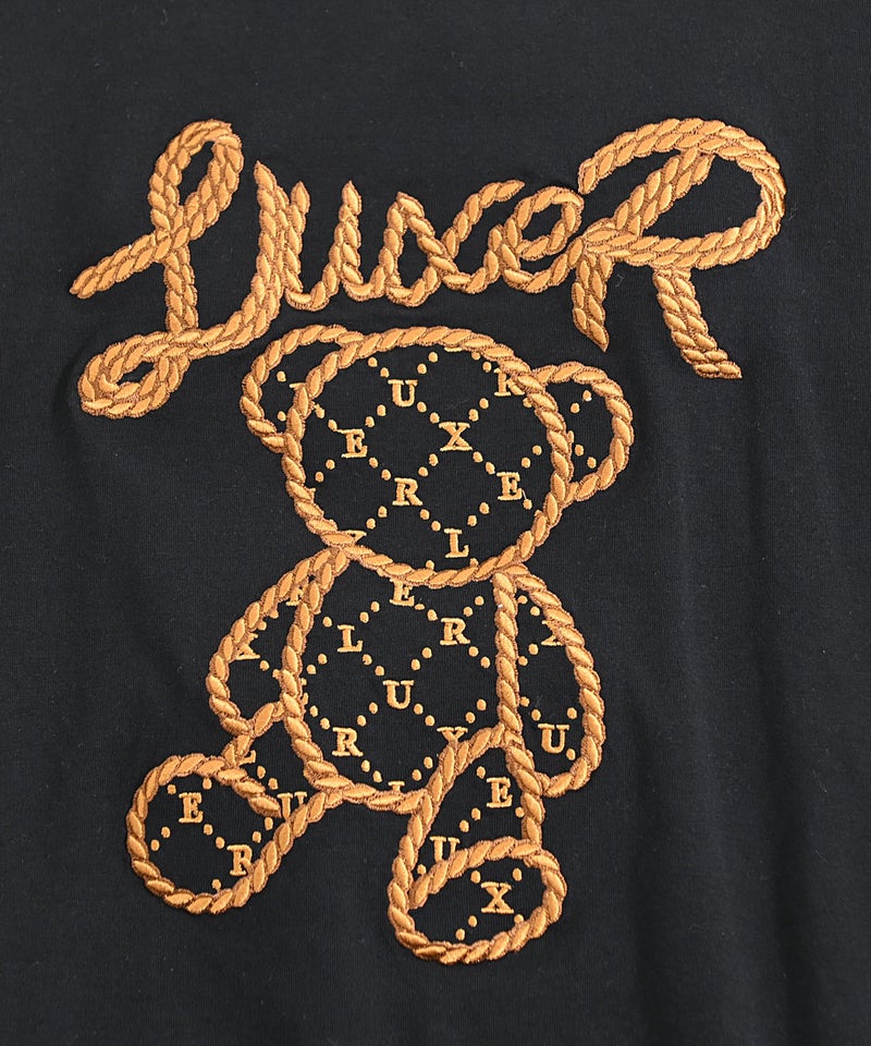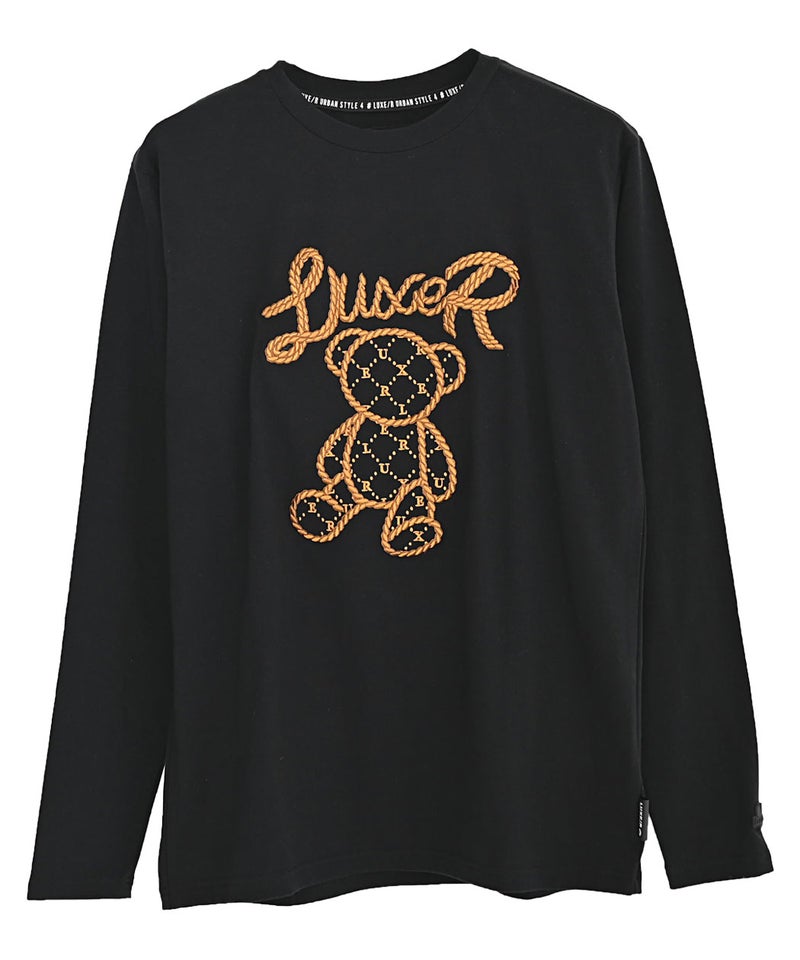 フロントには、ロープ調の立体刺繍で表現されたクマモチーフとロゴを配置し、シンプルながらも一枚で主役になるデザインに仕上げました。 LUXE/R(ラグジュ)ロープ刺繍クマロンTEE/全2色