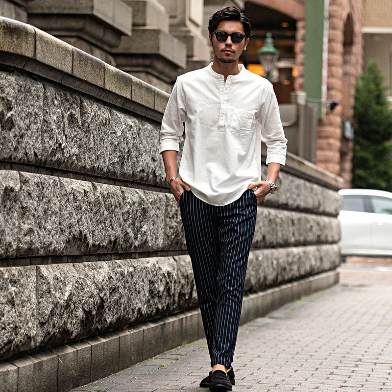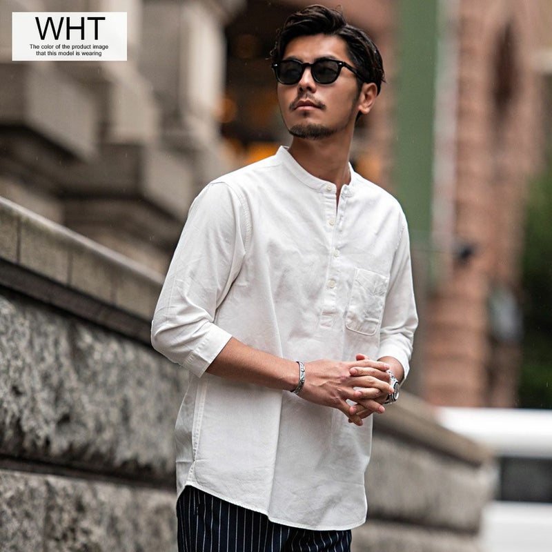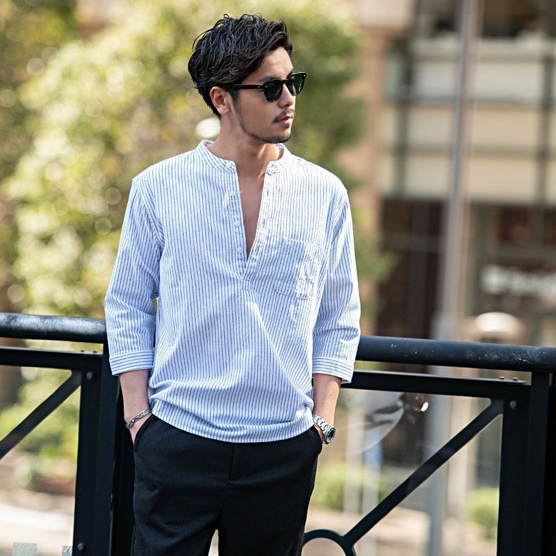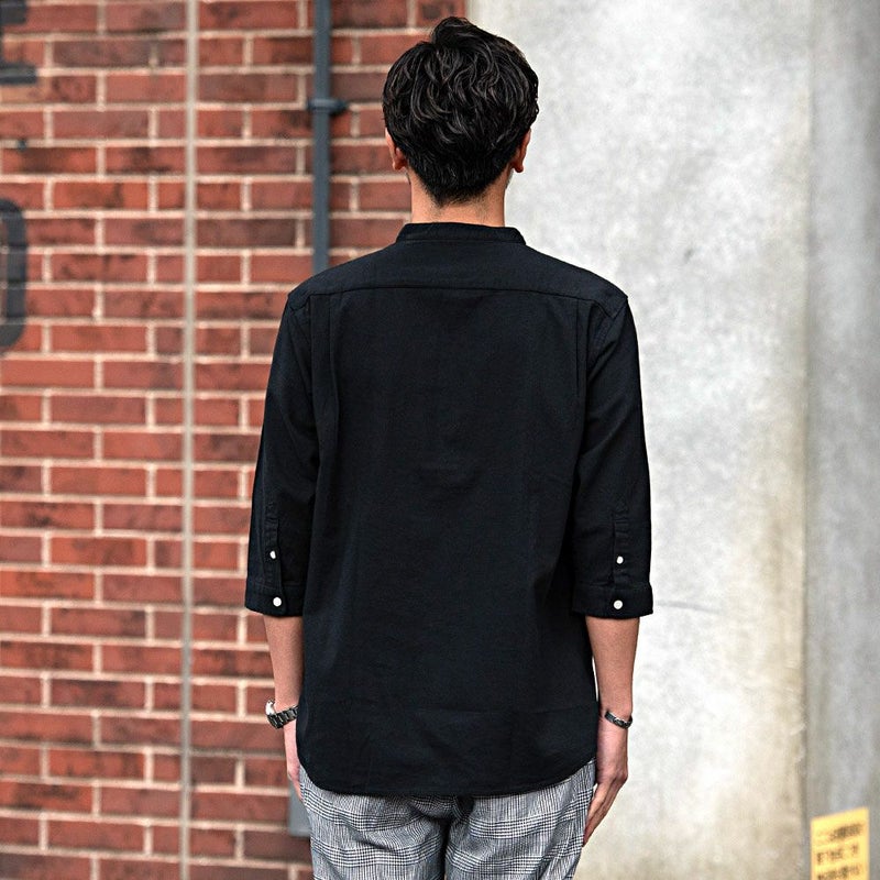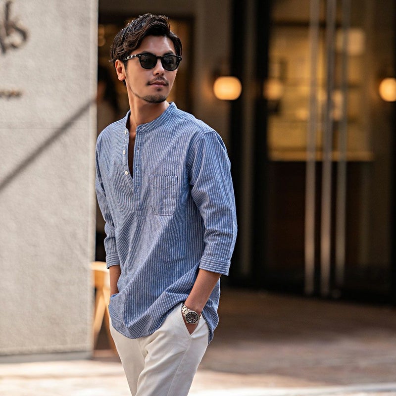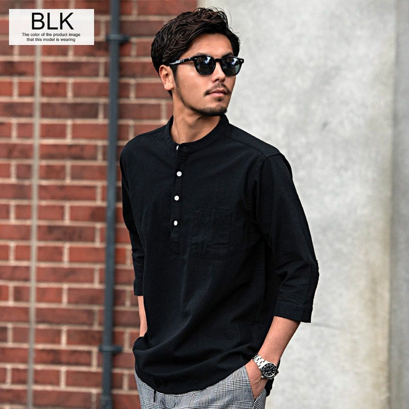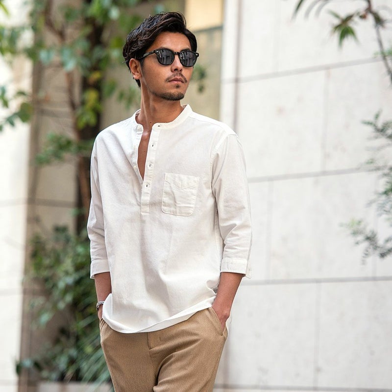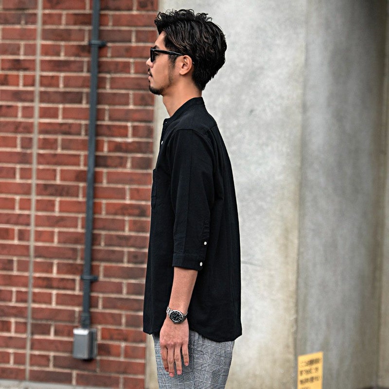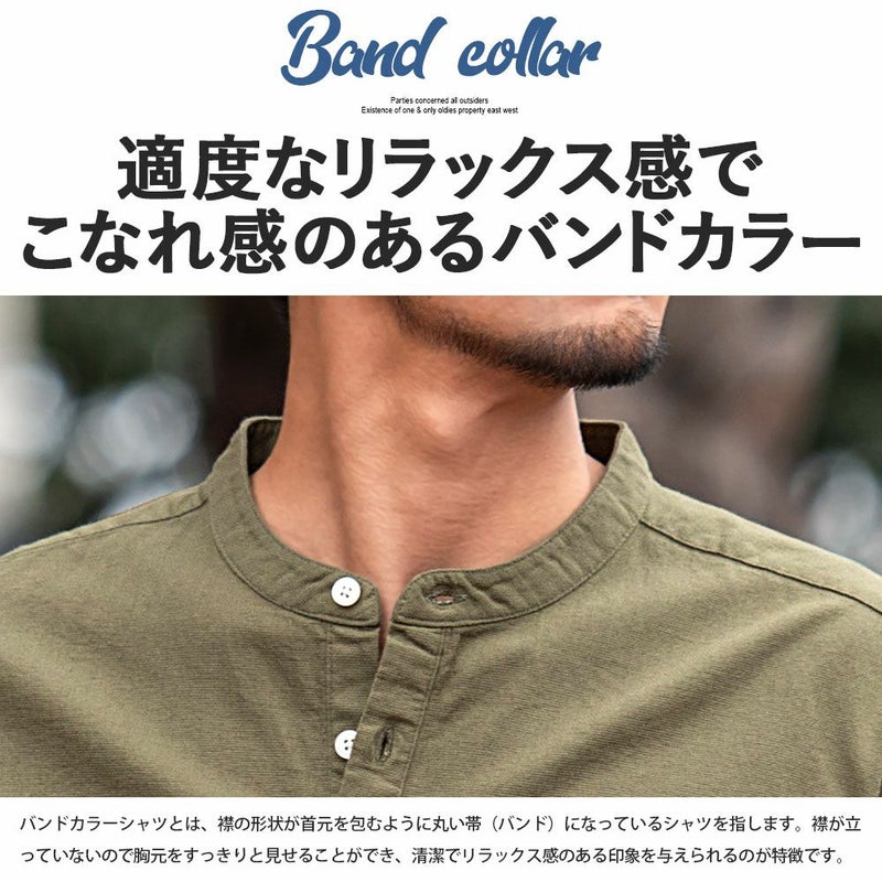 バンドカラーシャツとは、襟の形状が首元を包むように丸い帯(バンド)になっているシャツを指します。