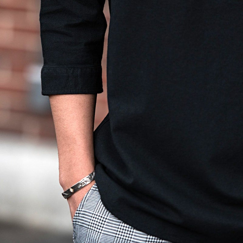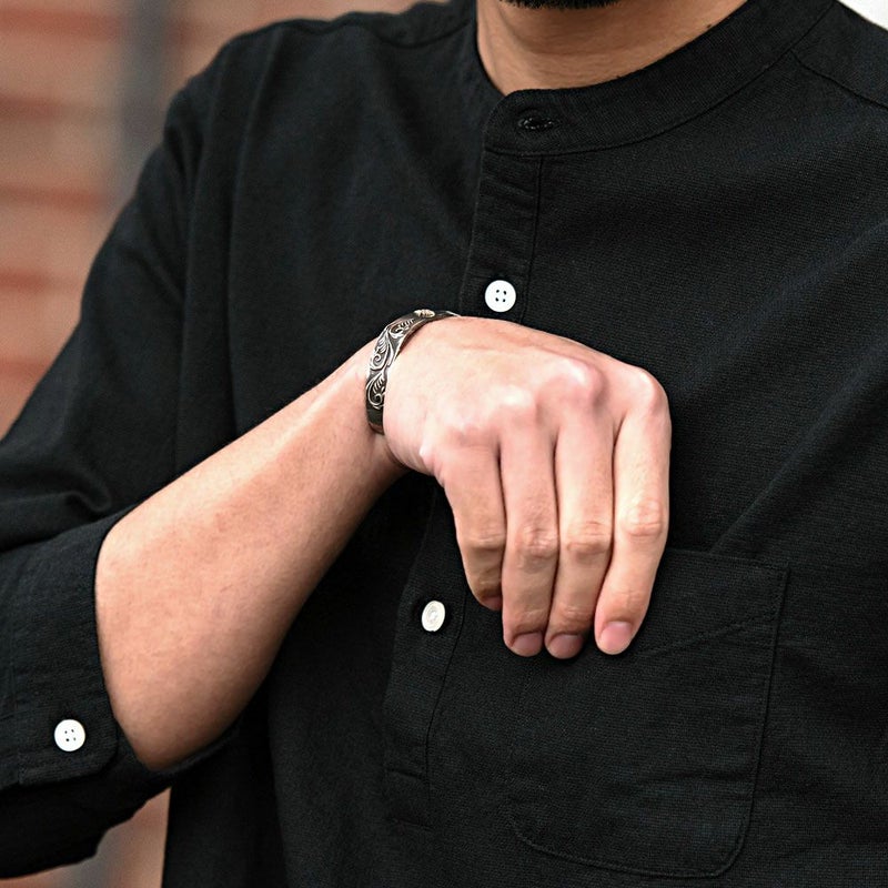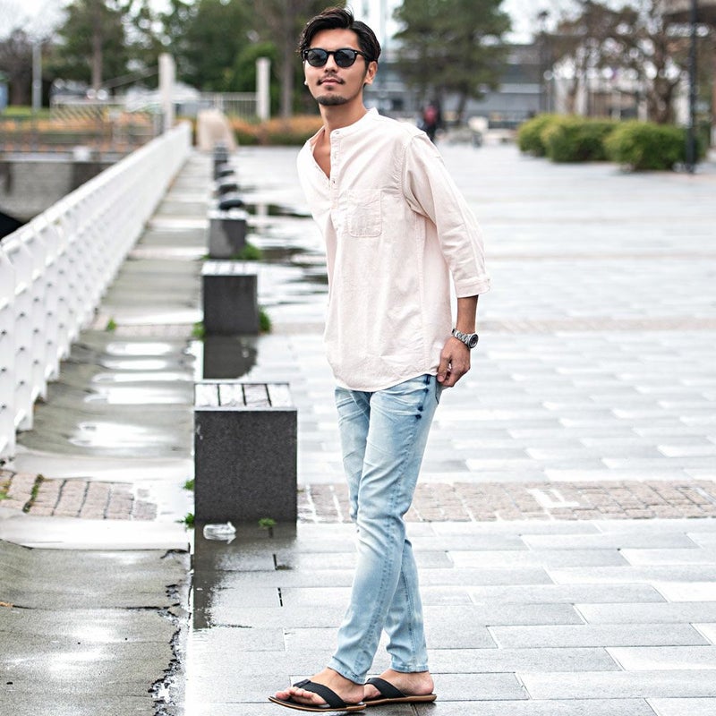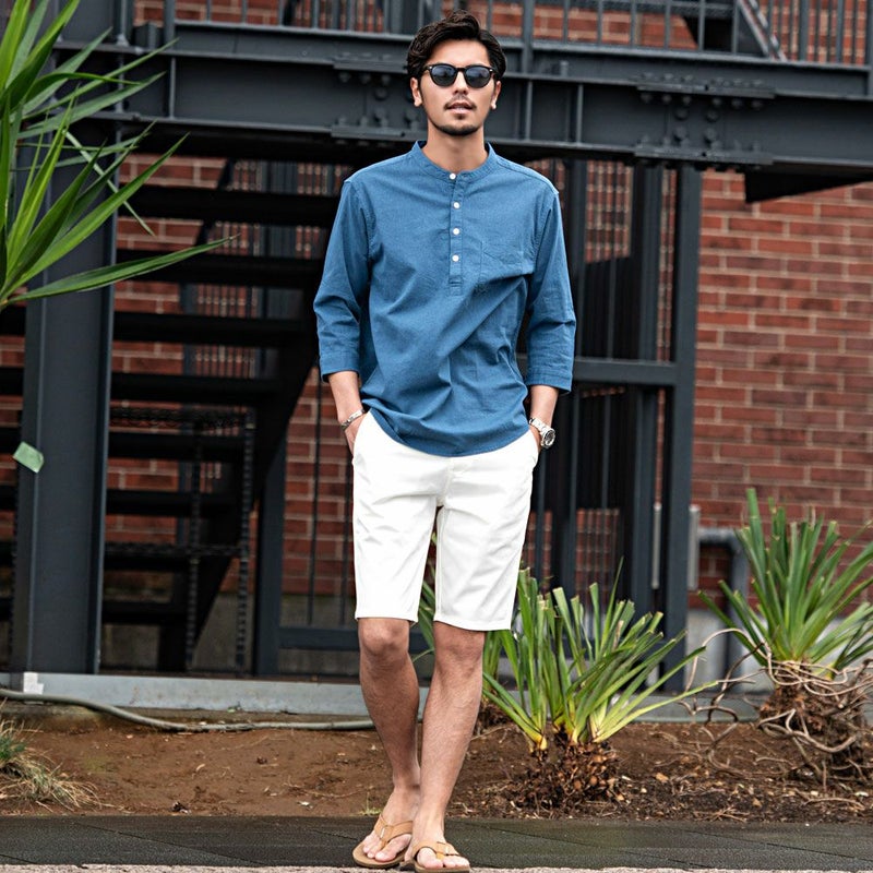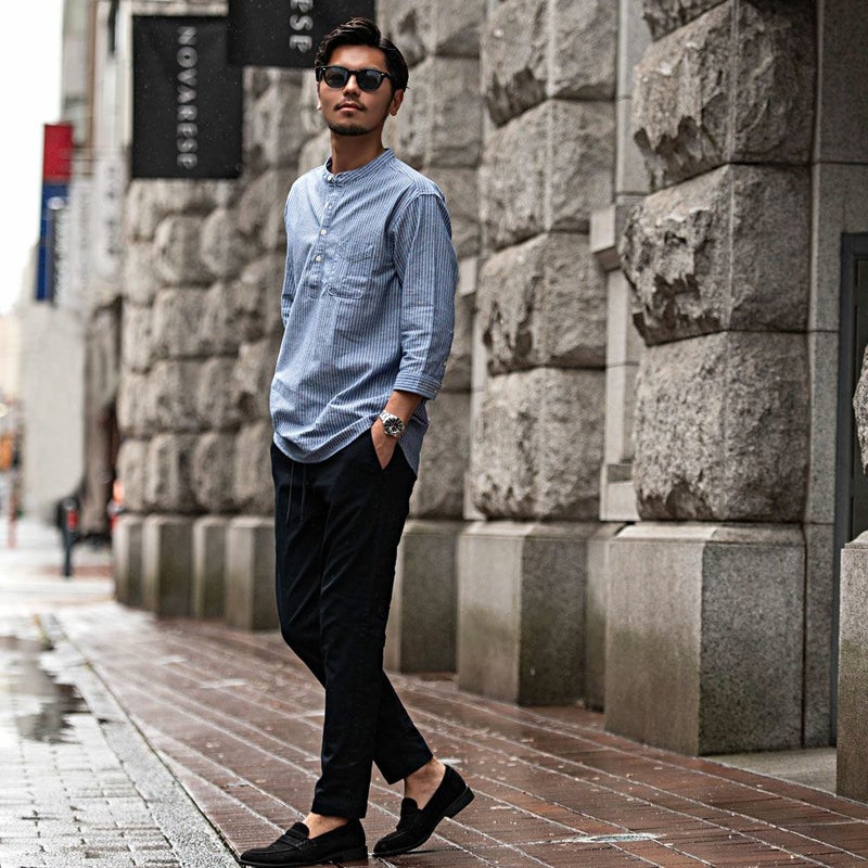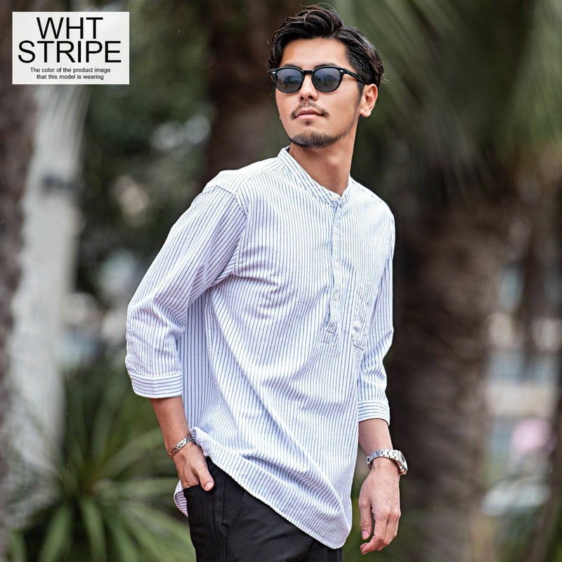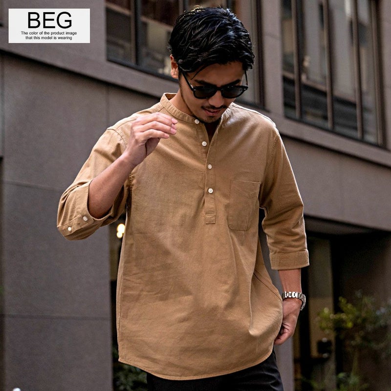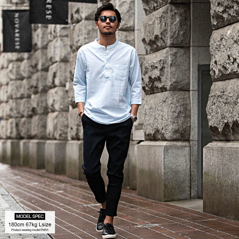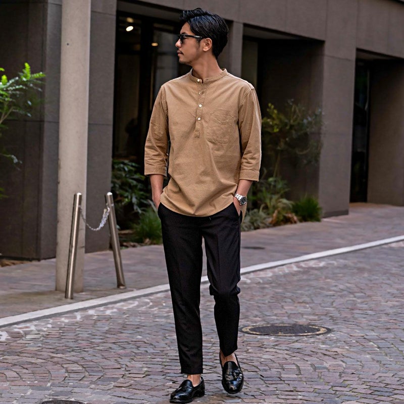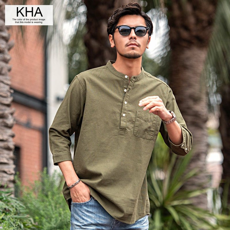 バンドカラーシャツとは、襟の形状が首元を包むように丸い帯(バンド)になっているシャツを指します。