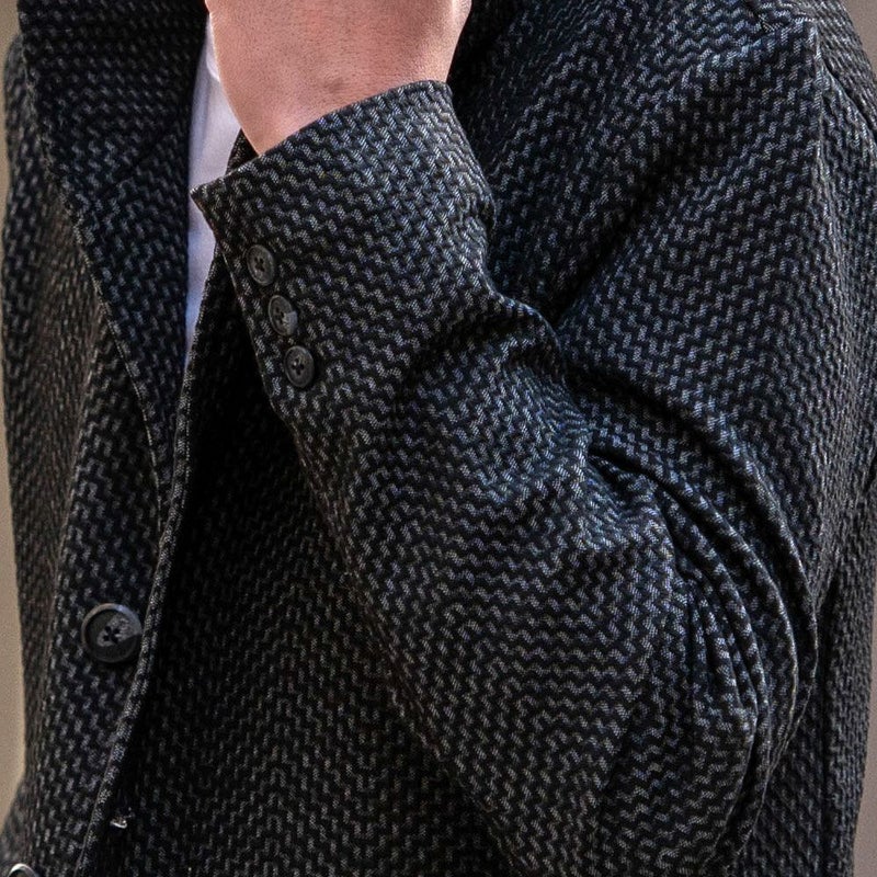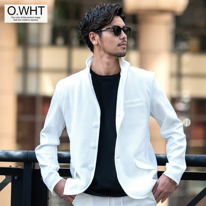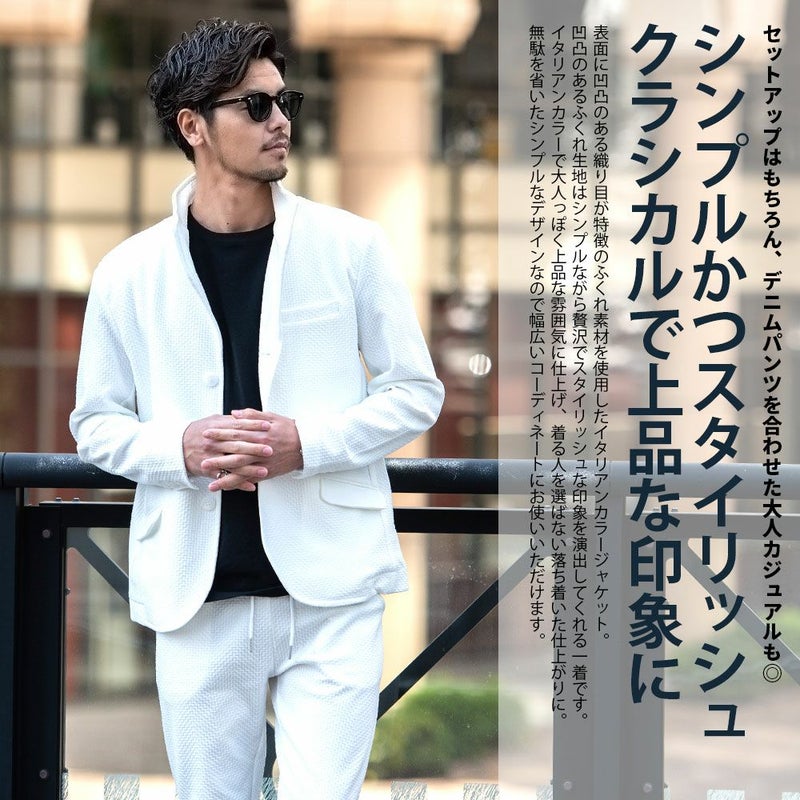 表面に凹凸のある織り目が特徴のふくれ素材を使用したイタリアンカラージャケット。