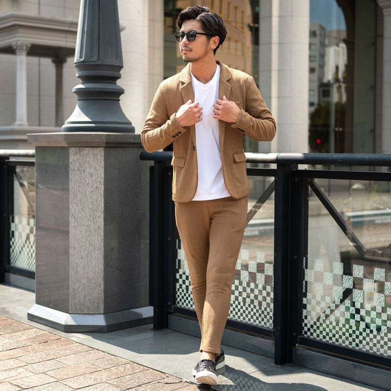 同素材の「ニットソーテーラードジャケット」と合わせたセットアップはもちろん、単品でもお使いいただけます。