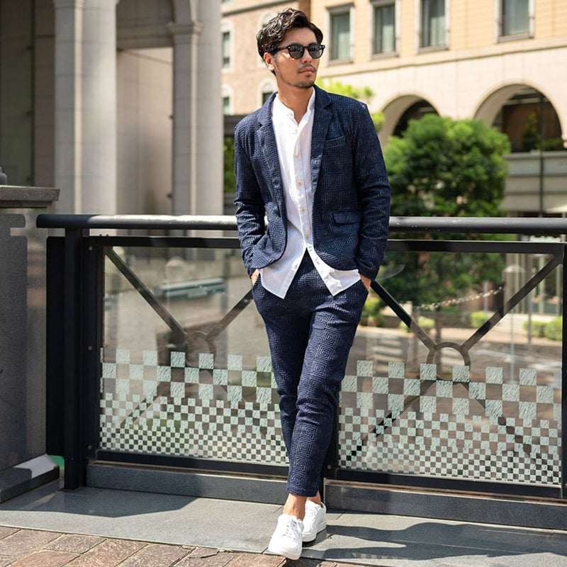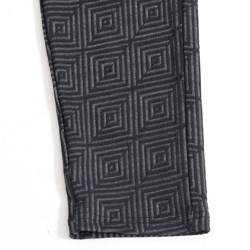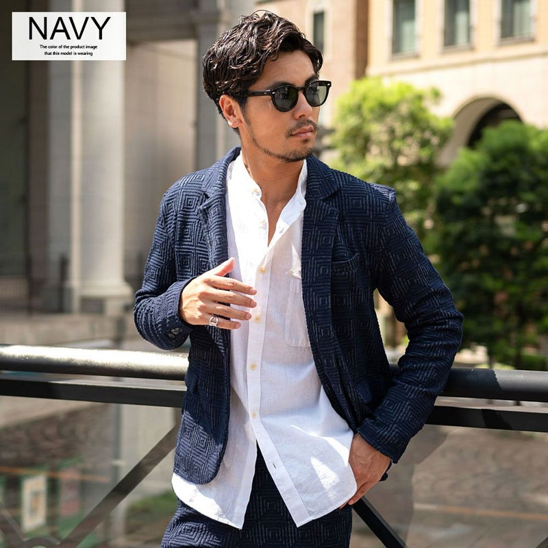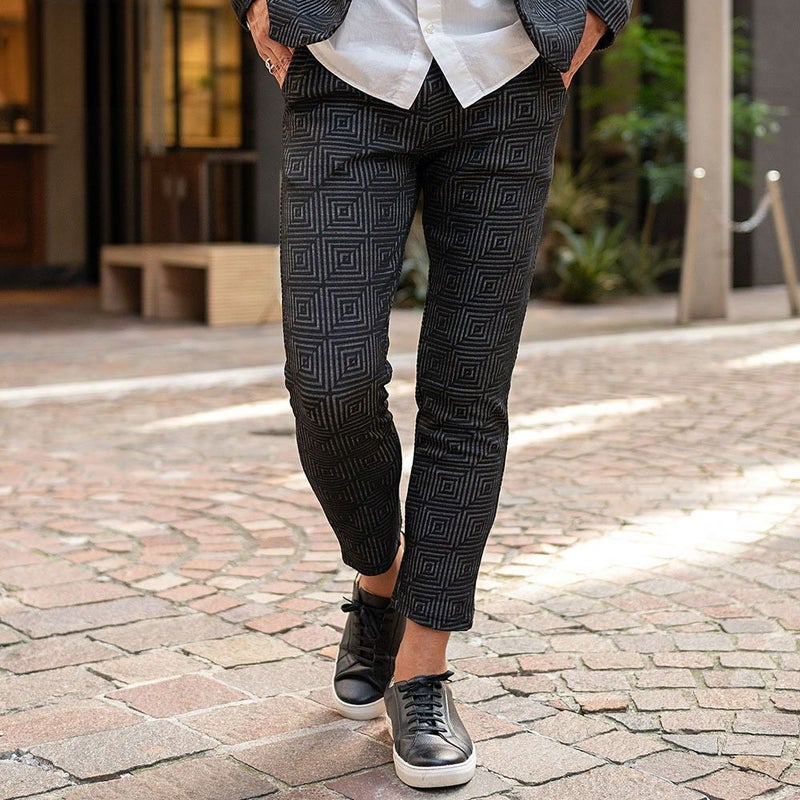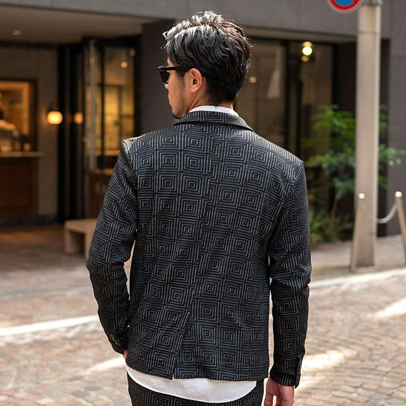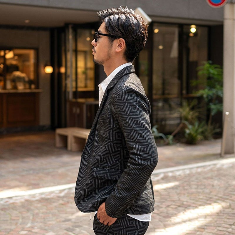 表面に凹凸のある織り柄が特徴のジャガード生地を使用し、スクエアパターンで構成された立体感のあるテーラードジャケットとアンクルパンツのセットアップ。