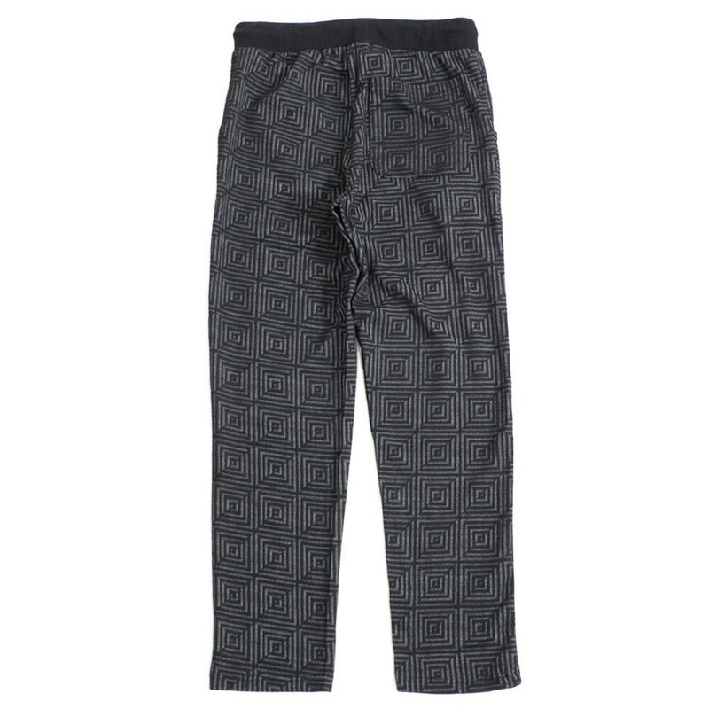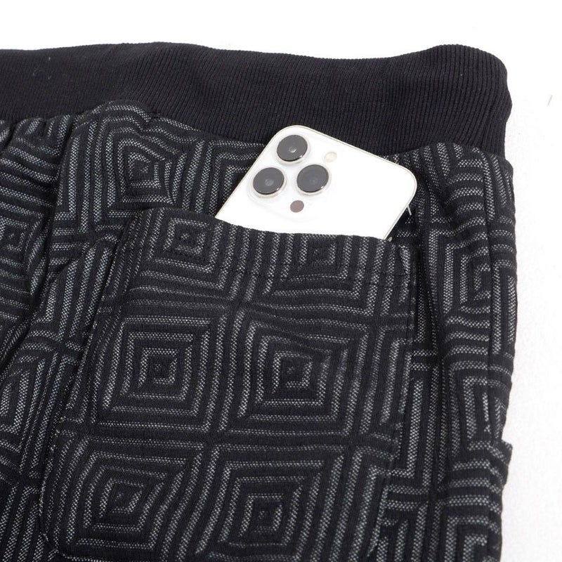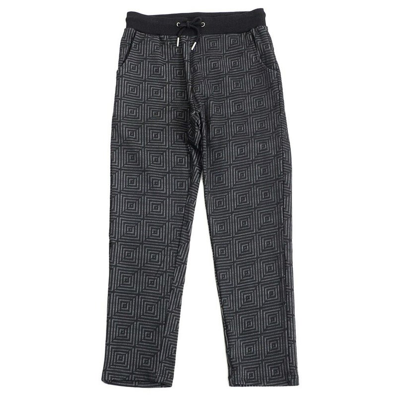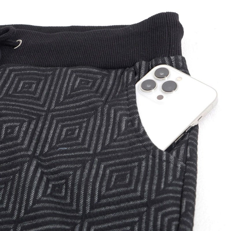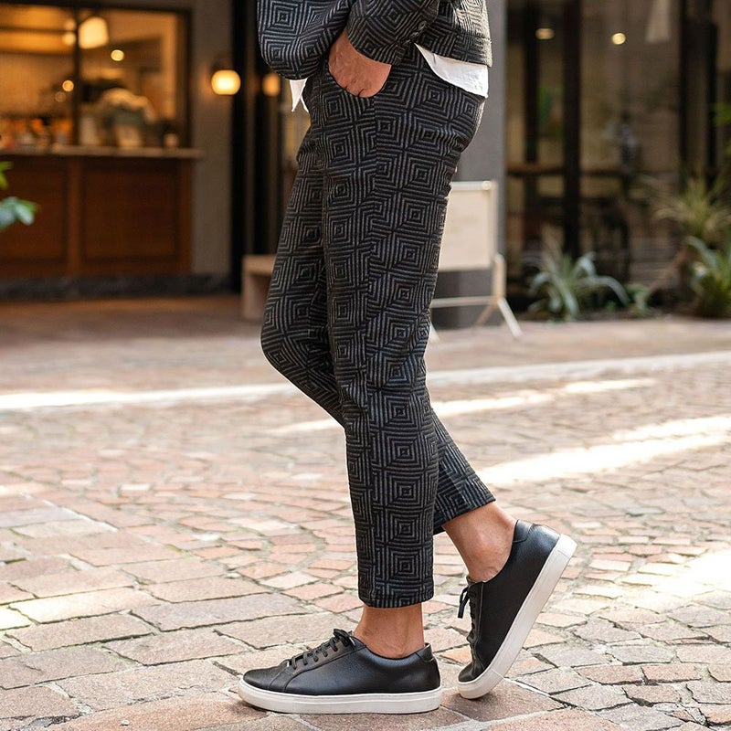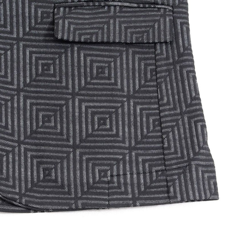 表面に凹凸のある織り柄が特徴のジャガード生地を使用し、スクエアパターンで構成された立体感のあるテーラードジャケットとアンクルパンツのセットアップ。