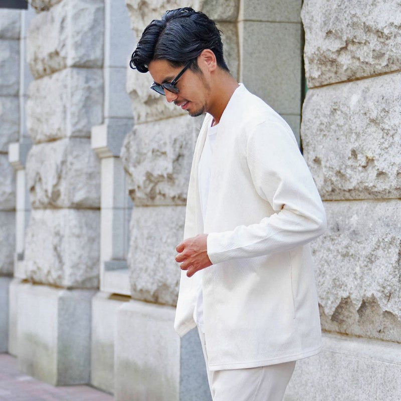 ノーカラー仕様のためシャツやカットソーとの相性が抜群で、首回りがすっきり見えるのも嬉しいポイント。